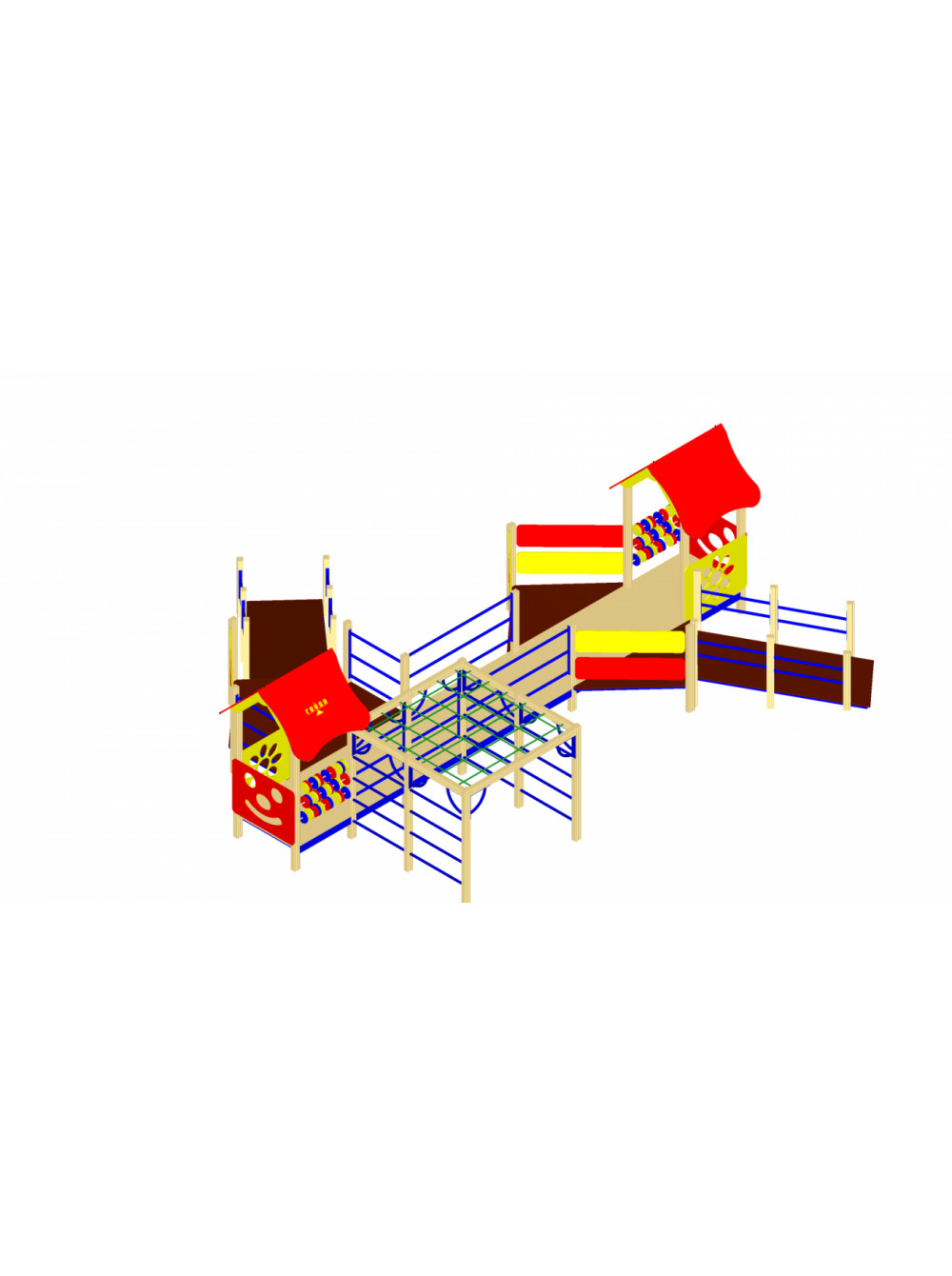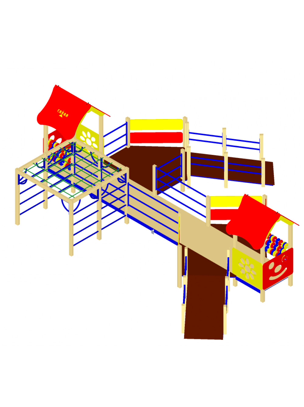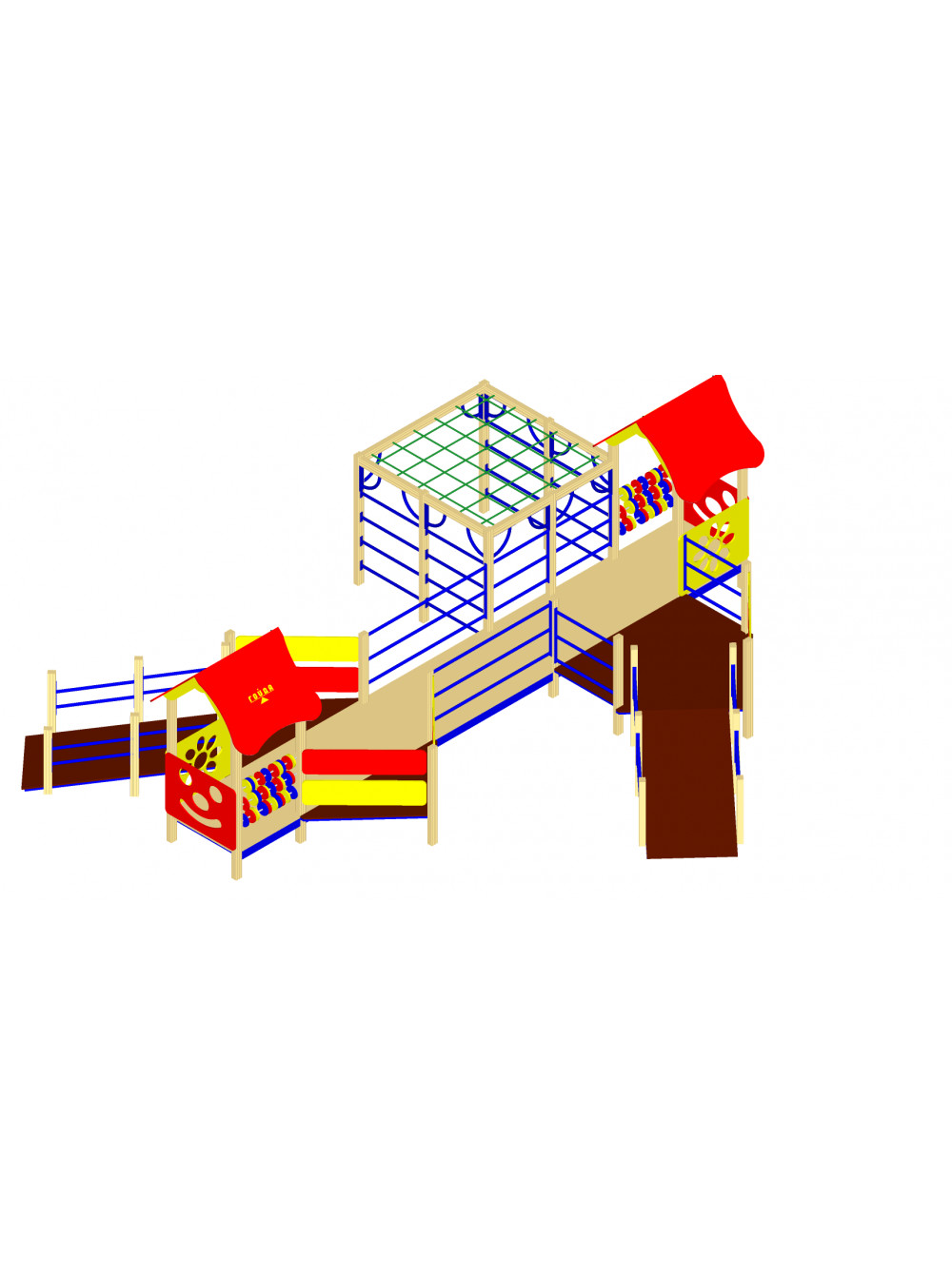 - Платформа ігрового майданчика виготовлена з соснових дощок, з'єднаних між собою за допомогою фанерного каркаса. Пофарбована фарбами стійкими до різних атмосферних явищ.