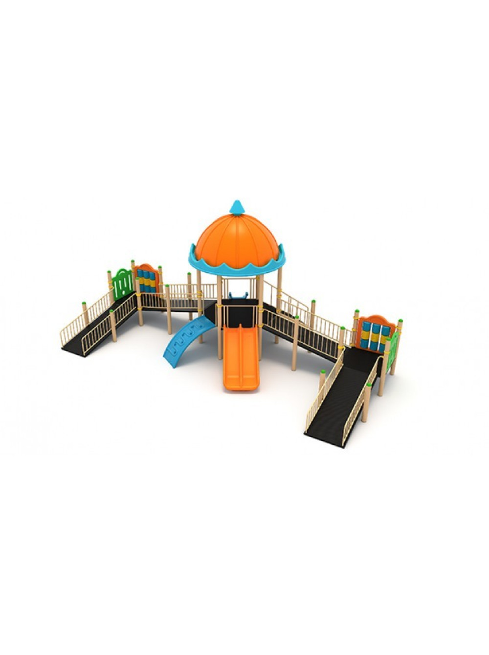 Ігровий майданчик для дітей з ОФП - ідеальна повчальна можливість з дитинства навчити вибудовувати стосунки і спілкуватися з людьми, не схожими на інших. Ігровий комплекс облаштований так, щоб на нім одночасно змогли грати дітки з різними фізичними можливостями.