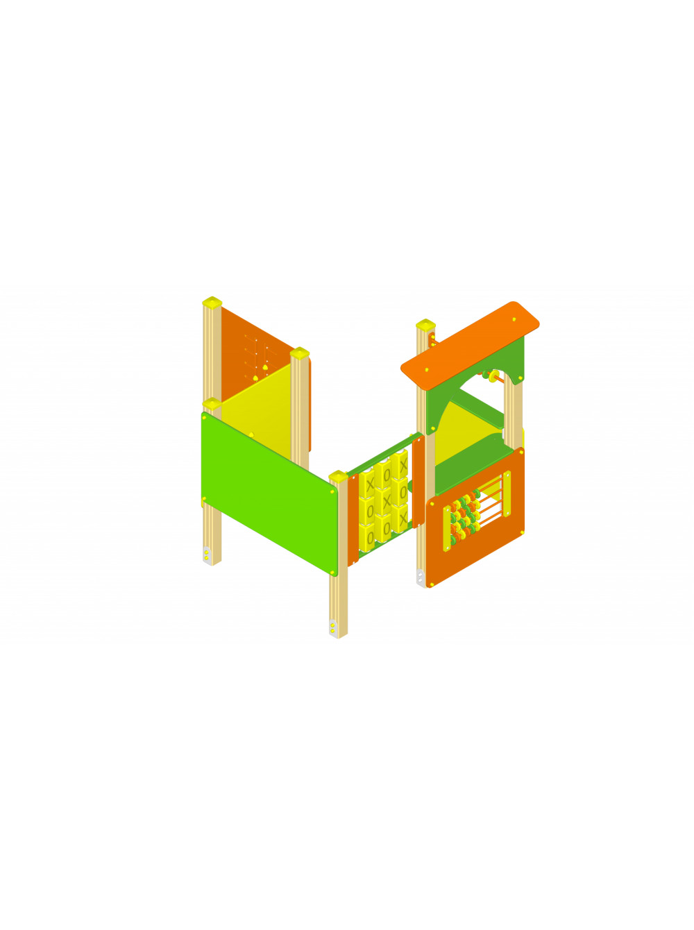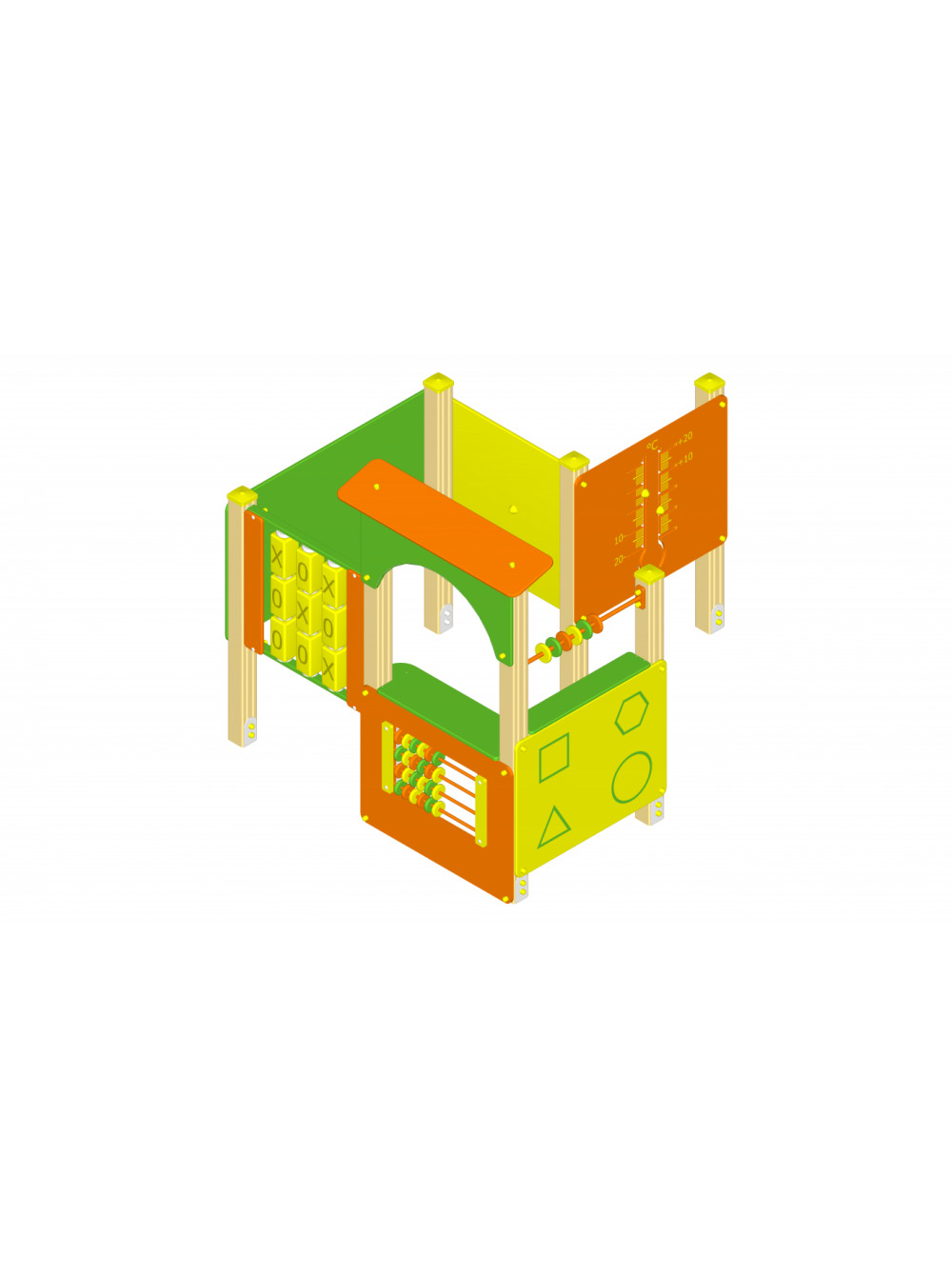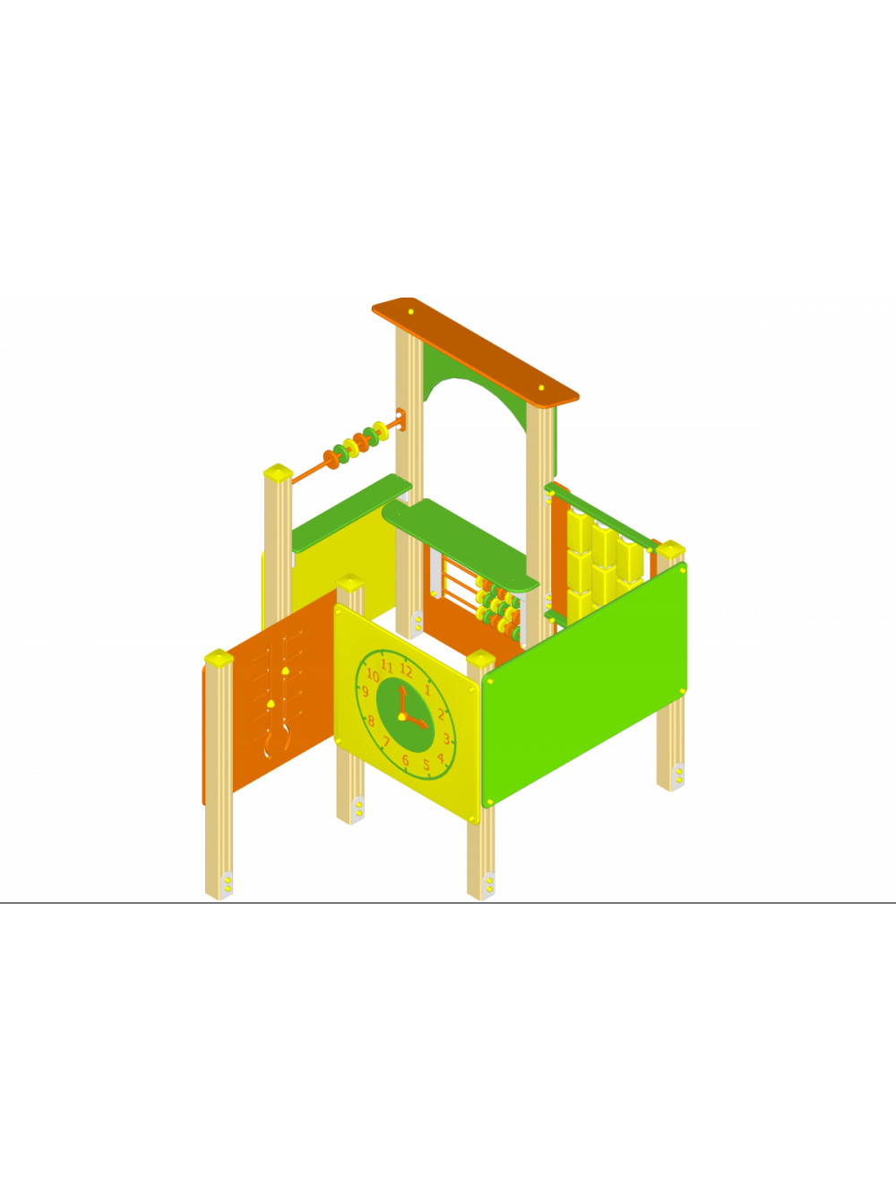 Ігровий комплекс Знайка для дітей з інвалідністю - цікава конструкція, виконана з інтерактивних, навчальних і розвивальних панелей і модулів. У комплекті ігровий модуль хрестики-нулики, панель із зображенням геометричних фігур і рахунками, магазин-прилавок з рахунками, стіна з годинником.