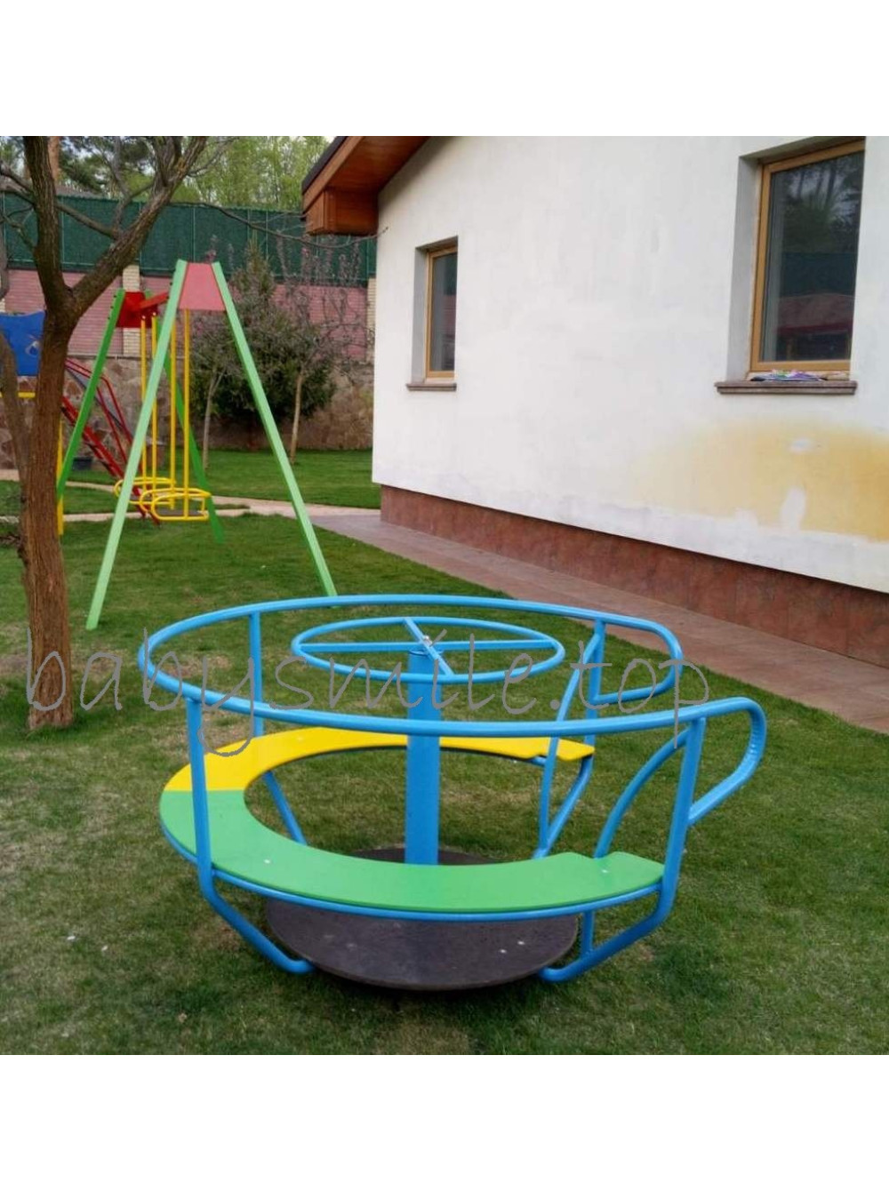 Карусель дитяча Небо- 1 призначена для використання на громадських дитячих майданчиках, де завжди багато дітвори і обов'язково знайдуться компаньйони для спільного катання. Такі каруселі розраховані на активну і енергійну експлуатацію. З боків сидіння встановлені захисні перила з металу, які унеможливлюють випадання дітей під час обертання каруселі. Можуть бути встановлені як на приватній території, так і для колективного користування - в парках, дитячих садах, санаторіях, приватних міні-готелях.