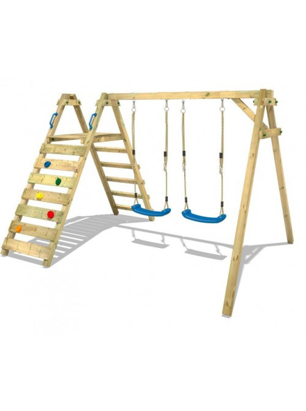 Гойдалка дитяча для дачі з скелелазою - це практично міні-майданчик для веселого дозвілля компанії дітлахів. Основний акцент зроблено на всіма улюблені гойдалки, їх тут дві і дітям не доведеться довго чекати своєї черги, що б погойдатися. Для більш активного дозвілля підійде драбинка і скелелаза з оглядовим майданчиком, з якими можна придумати різноманітні забави від простих підтягувань до тематичних ігор, наприклад в альпіністів або солдатів на сторожі.