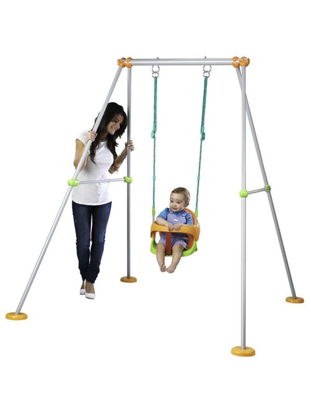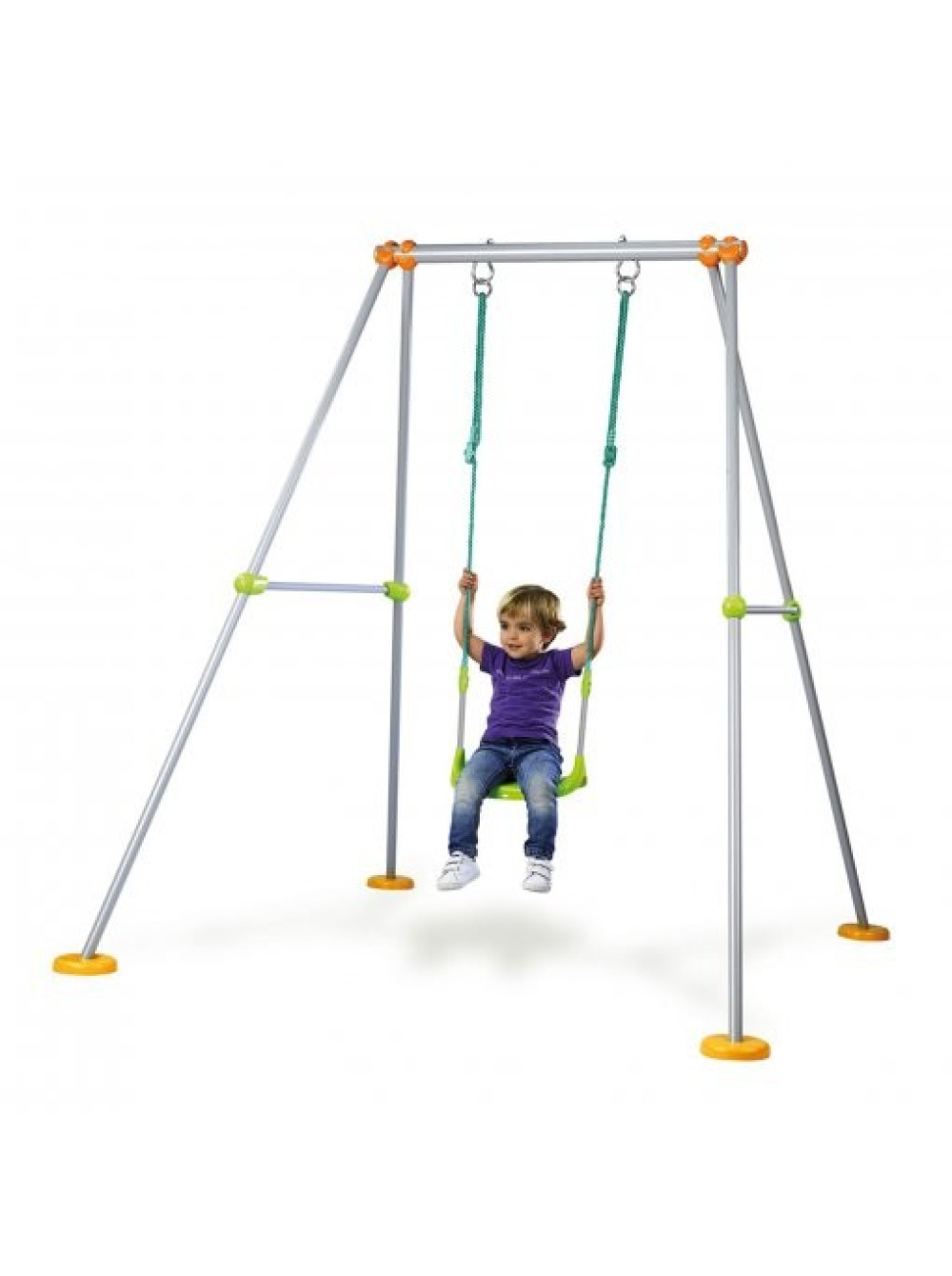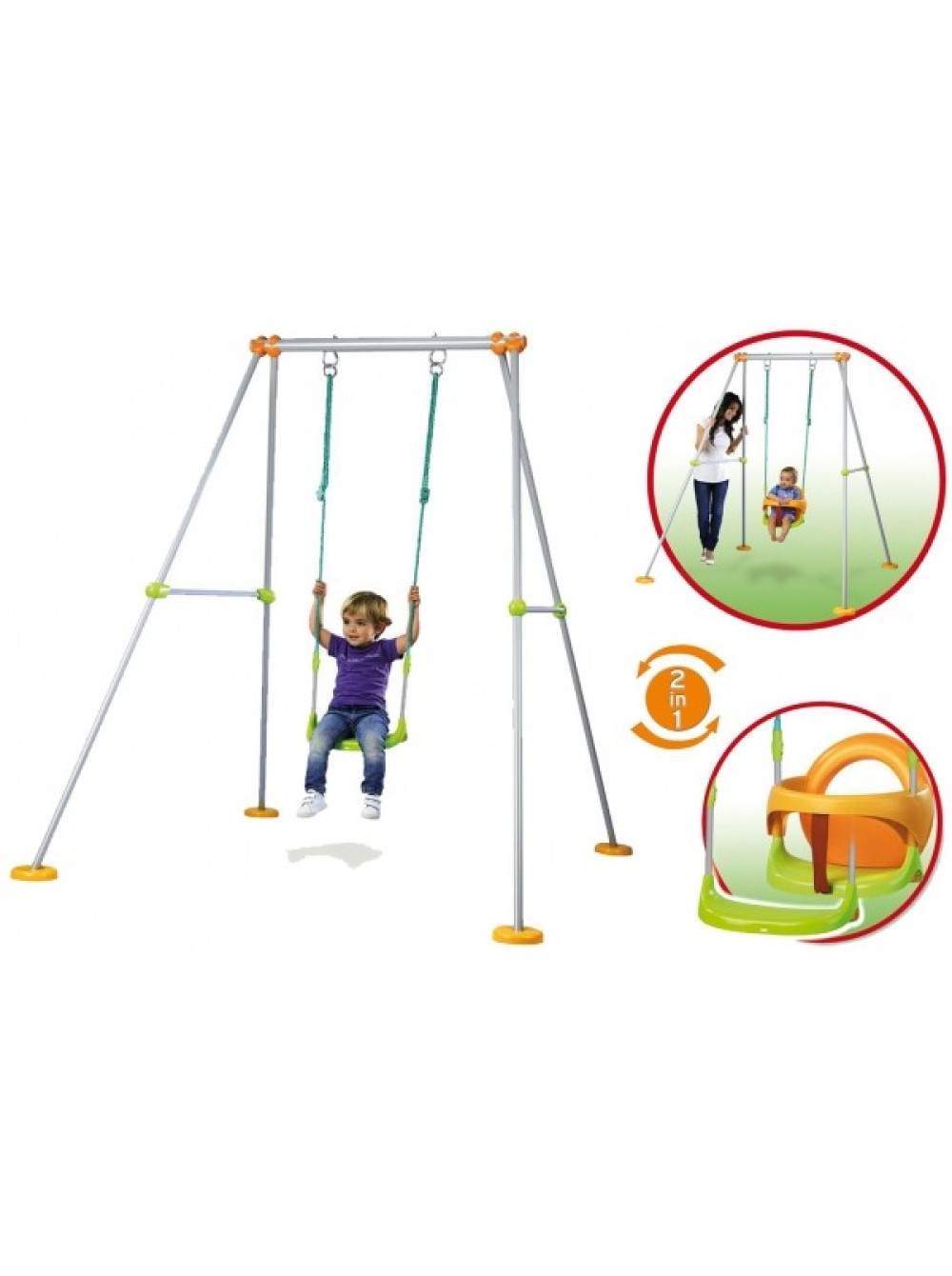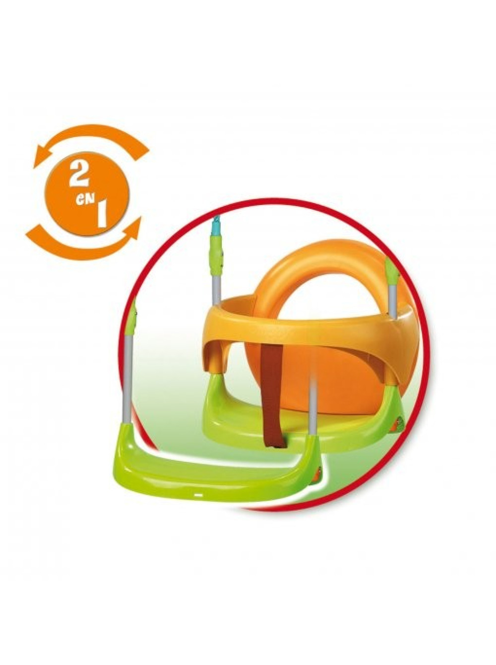 У цих гойдалок дуже функціональне сидіння, коли дитина ще зовсім маленька, можна встановити захисний обідок та спинку, а коли малюк підросте, то довжина ременів регулюється, спинку та захисний бампер можна зняти (від 5 років) і у Вас вийдуть гойдалки цікавіші для старших дітлахів. Конструкція виконана з нешкідливих для дітей і  стійких до сонячних променів матеріалів: пластика і металу.
