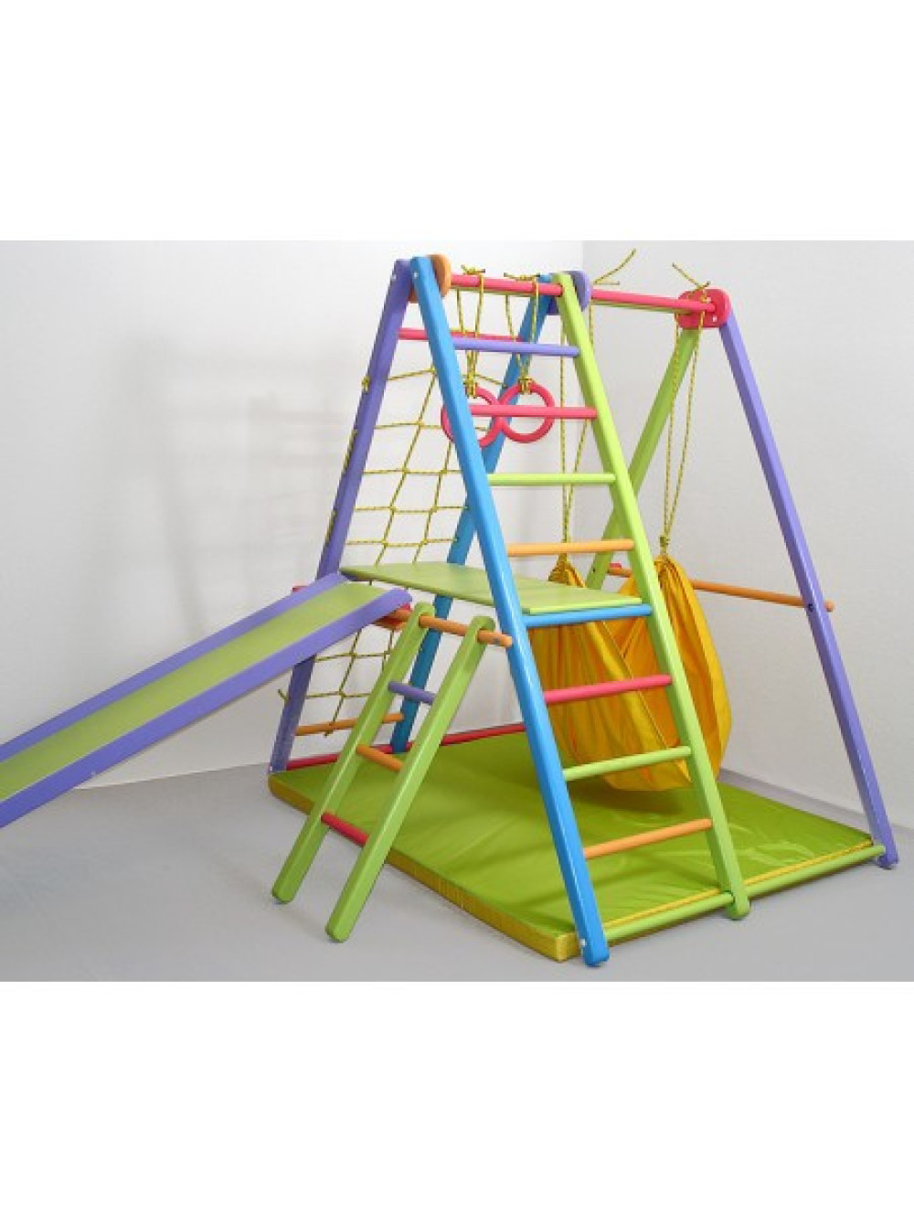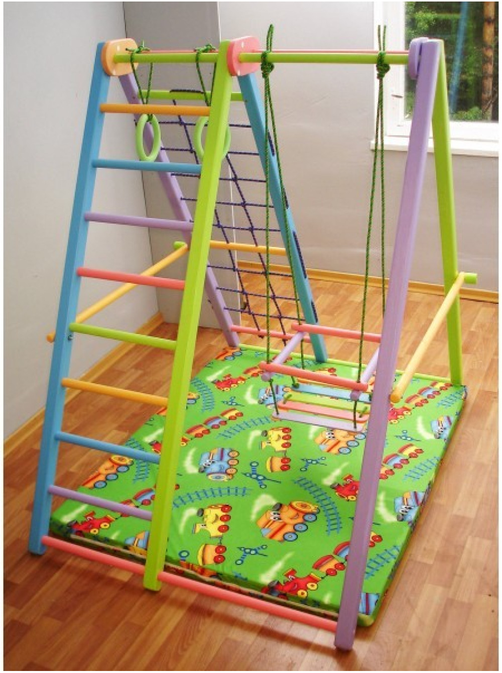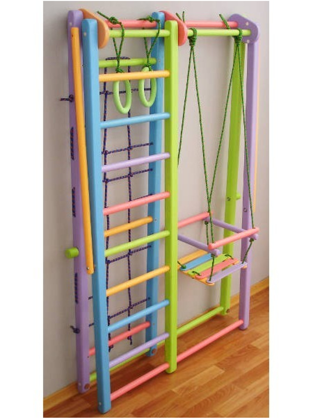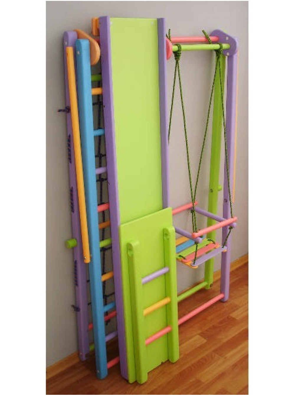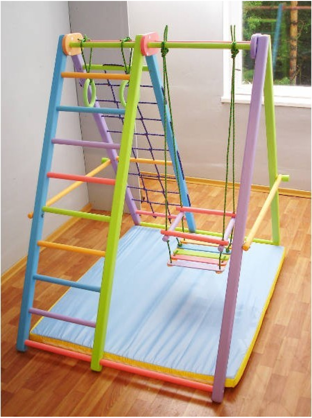 У базову комплектацію входять гімнастичні кільця і гойдалки. Цей комплекс дуже вдало можна розмістити у будь-якій квартирі, так як конструкція не вимагає спеціального кріплення її можна встановити навіть в приміщенні з картонними перегородками. До того ж комплекс легко складається, в складеному вигляді він легко розташуватися за дверима або шафою, його можна навіть винести на балкон, а дістати і розкласти коли дитина знову захоче грати. Товщина переклади комплексу 25 мм, розрахована так, що б Ваш малюк міг легко обхопити її своїми ручками.