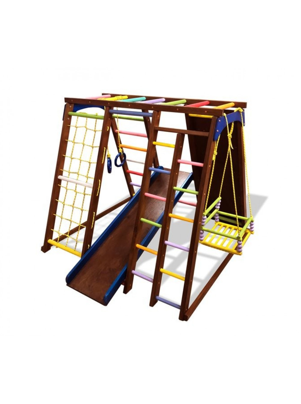 Комплекс раннього розвитку із скалолазкой і гойдалкою - відмінна ідея для оснащення спортивної зони в кімнаті малюка. На відміну від інших дитячих комплексів ця модель доповнена скалодромом, який виконує функції тренажера для скелелазіння. І виконаний з листа вологостійкої фанери із зачіпками у формі каменів. Це захоплююче доповнення робить комплекс цікавішим і цікавішим.