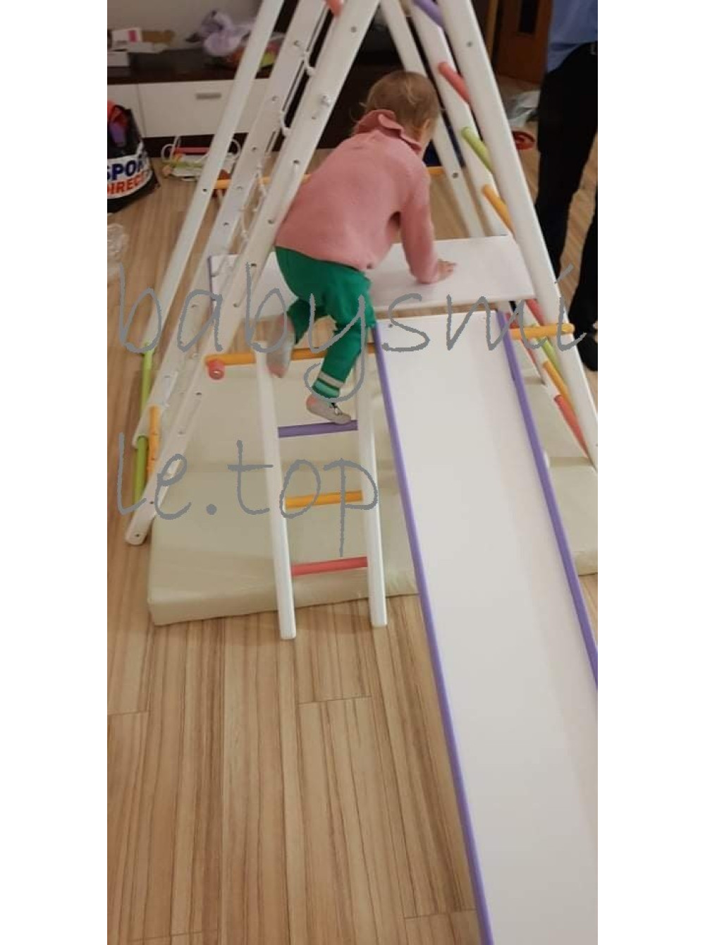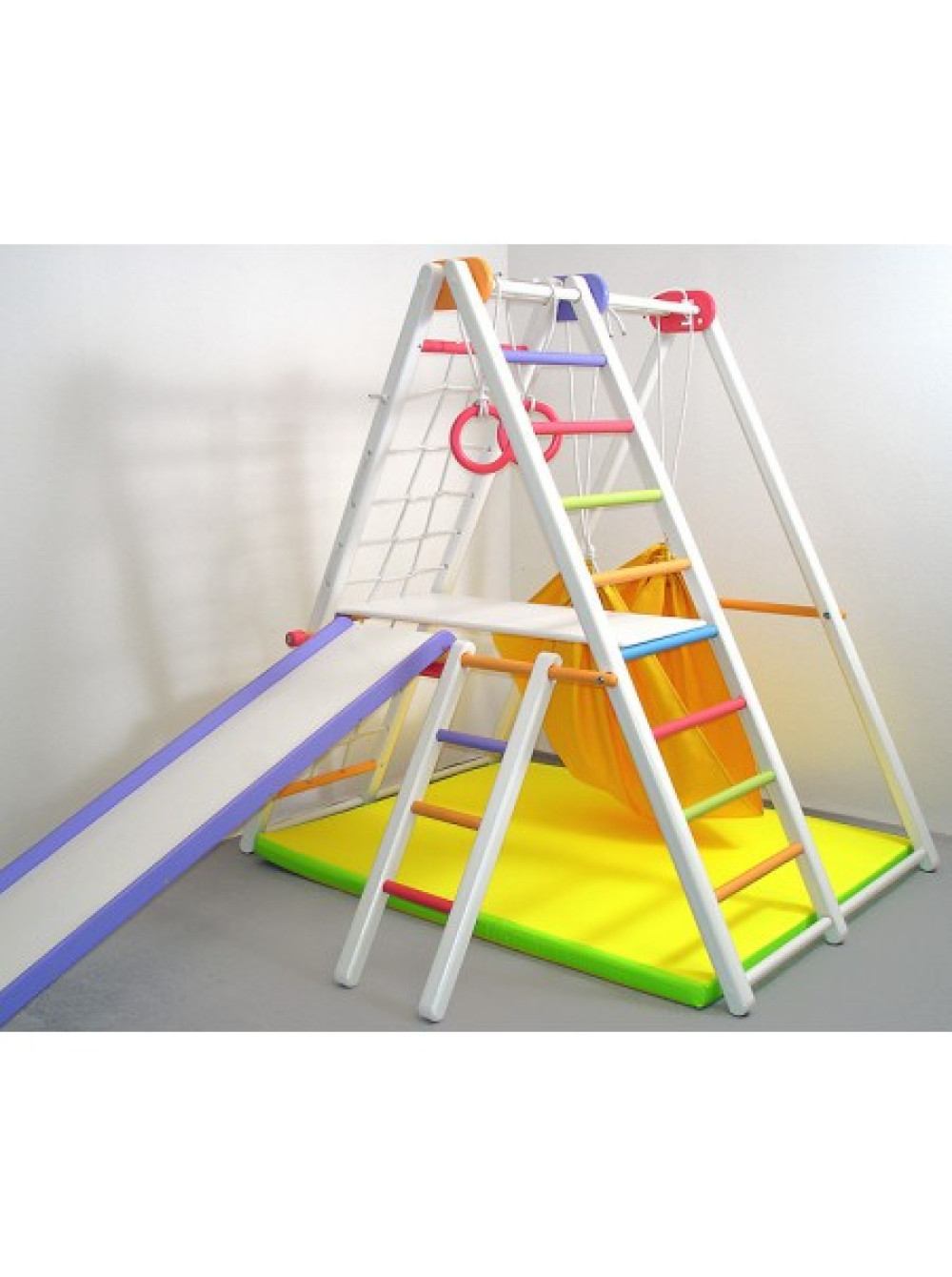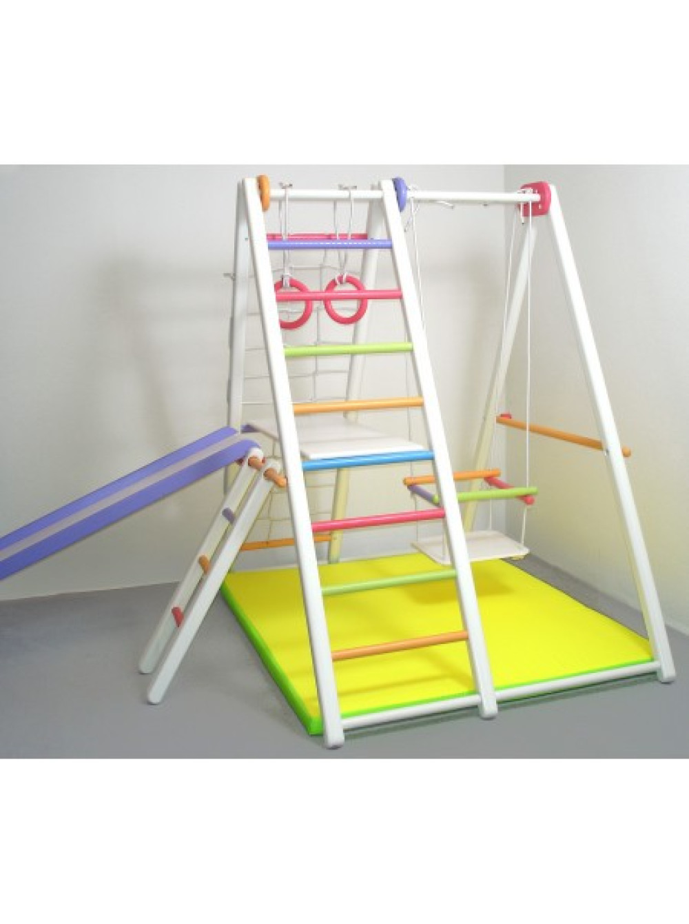 Цей комплекс дуже вдало можна розмістити в будь-якій квартирі, конструкція не вимагає спеціального кріплення. До того ж комплекс легко складається, в складеному вигляді його можна розташувати за дверима або винести на балкон і розкласти коли дитина знову захоче грати. Товщина переклади комплексу 25 мм, цього достатньо для того, що б Ваш малюк міг легко обхопити її своїми дитячими ручками.