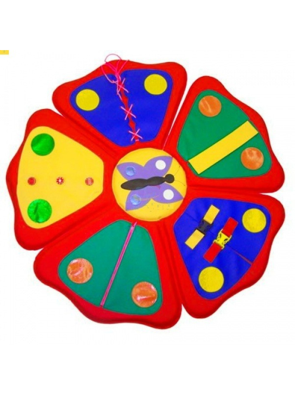 Дидактичний килимок Квіточка - барвистий виріб із зображенням метелика в центрі квітки. Кожна пелюстка містить будь-яке завдання для розвитку моторики рук і логічного мислення. Може використовуватися як великий килимок на липучках або розкладатися на окремі невеликі елементи-пелюстки. Прекрасно підходить для колективних занять або ігор або для індивідуального користування.