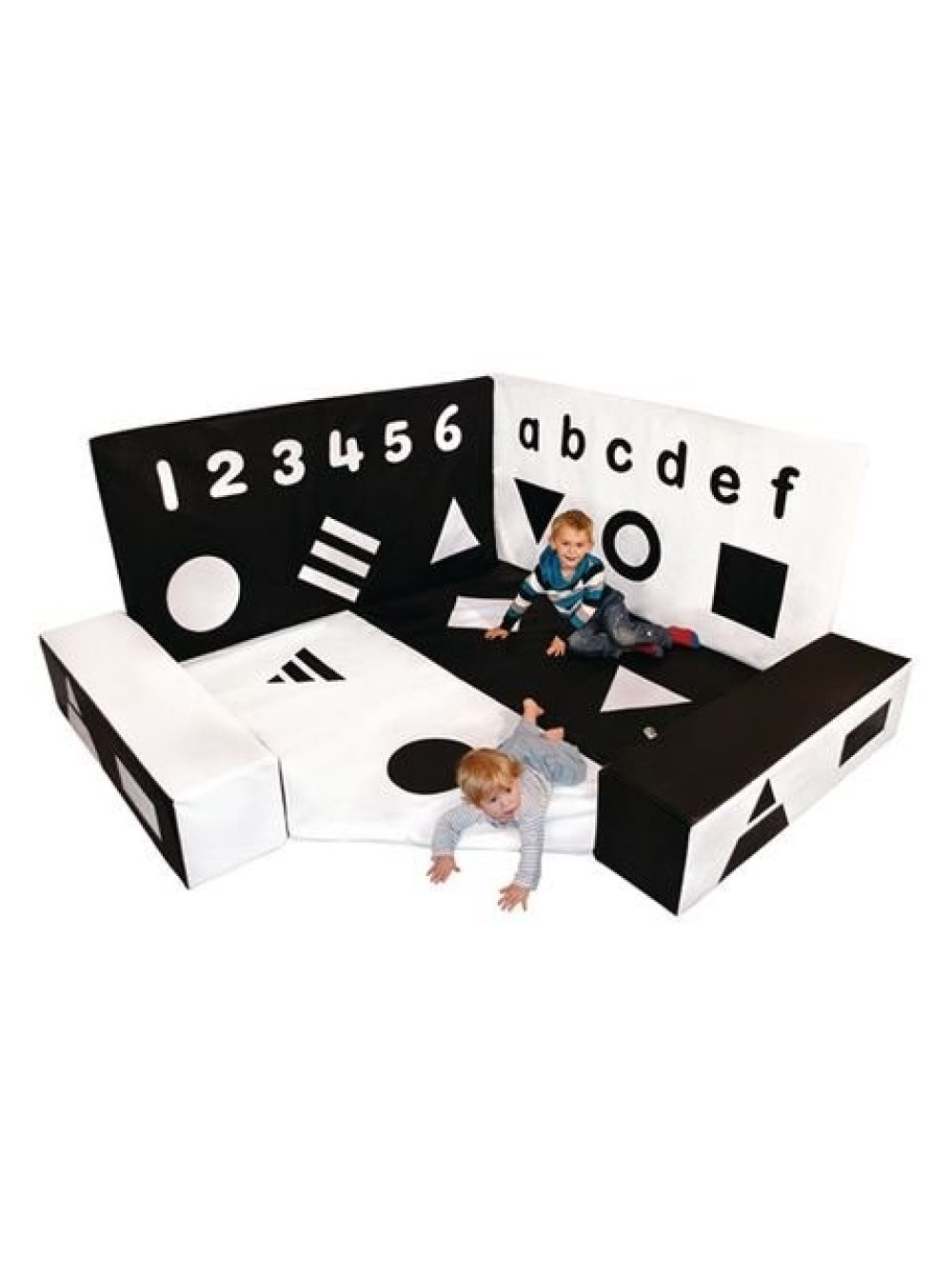 Сенсорний м'який куточок Грай вивчай - останні тенденції щодо забезпечення ігрових зон безпечними м'якими модулями все більше зміщуються в бік куточків, повністю покритих матами. Цей новий чорно-білий дидактичний комплект виконаний в контрастних кольорах - чорному і білому, щоб максимально чітко виділити кольори, букви і форми, для кращого сприйняття і навчання.