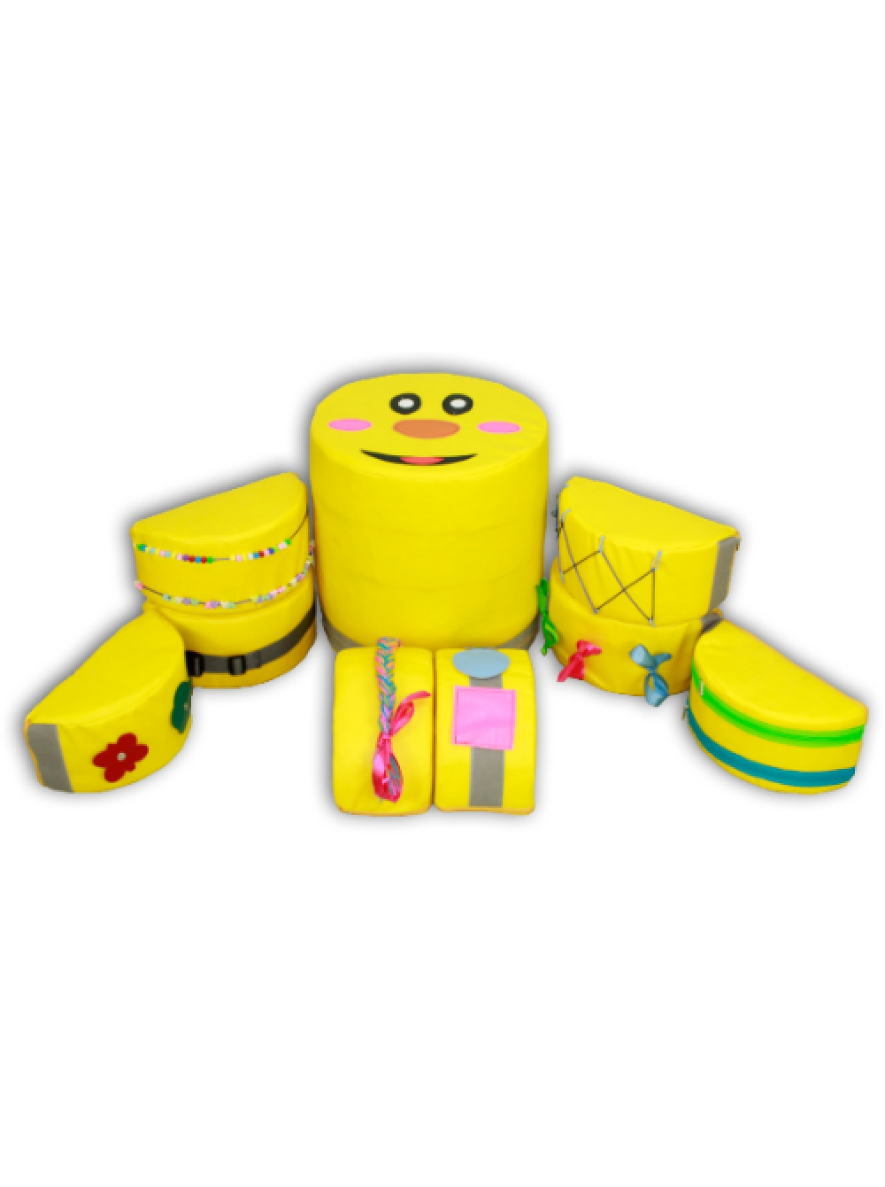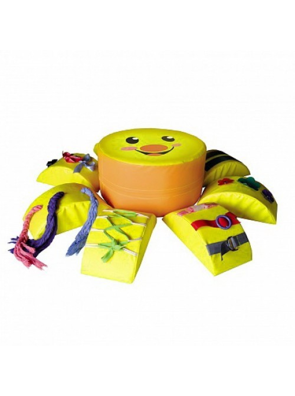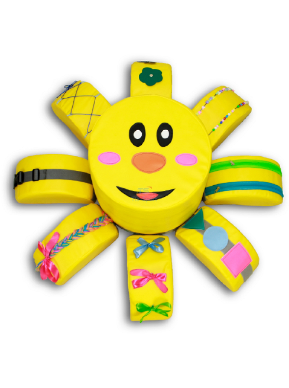 Розвиваючий м'який модуль Сонечко - цікавий посібник для діток у вигляді м'якого пуфа усередині і восьми дидактичних доповнень у вигляді проміннячок сонця. Кожен, так званий, промінець укомплектований різними предметами у вигляді вірьовок, стрічечок, квіточок.