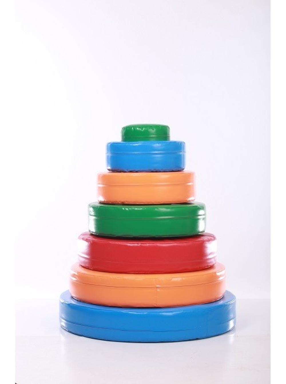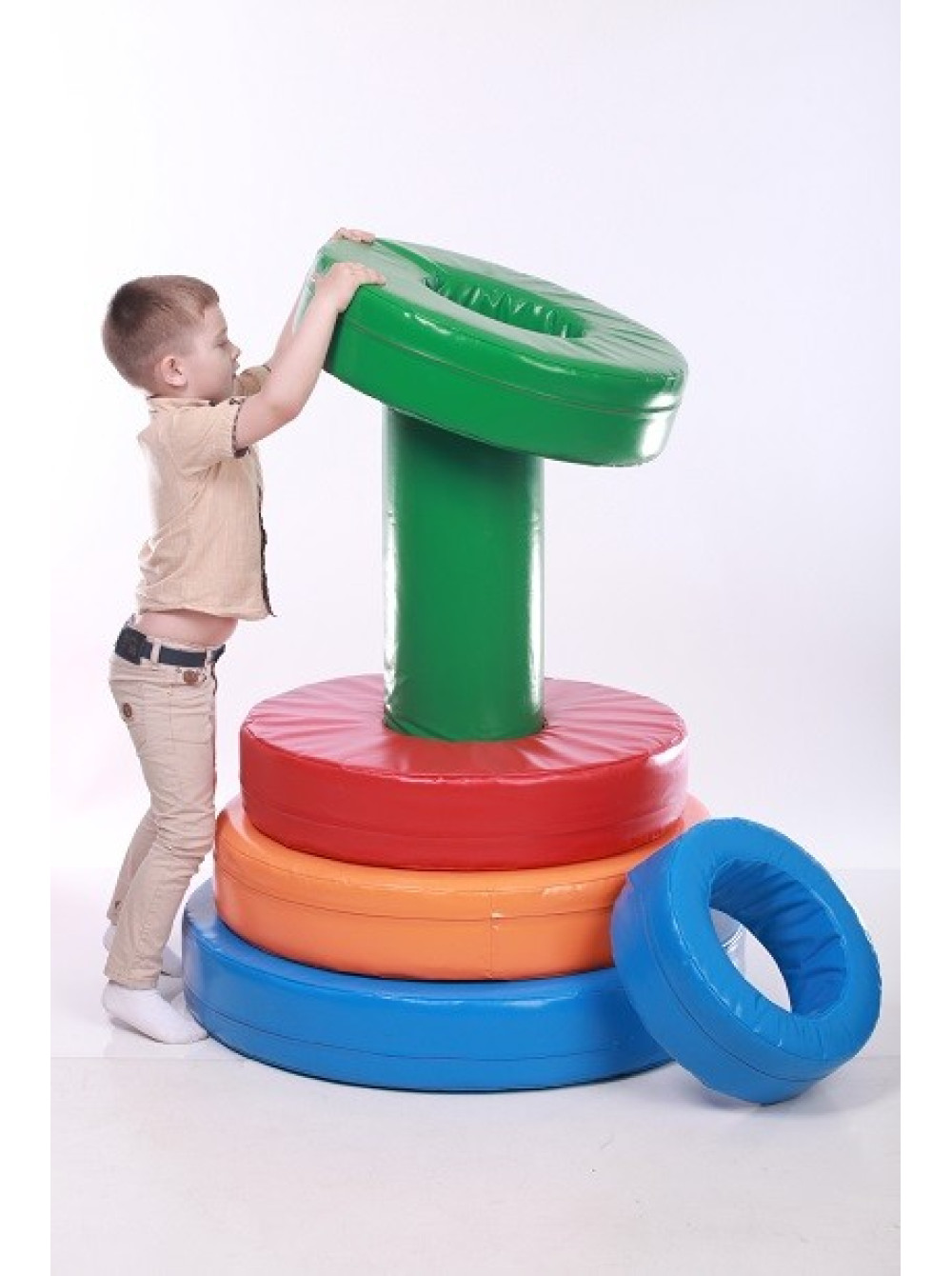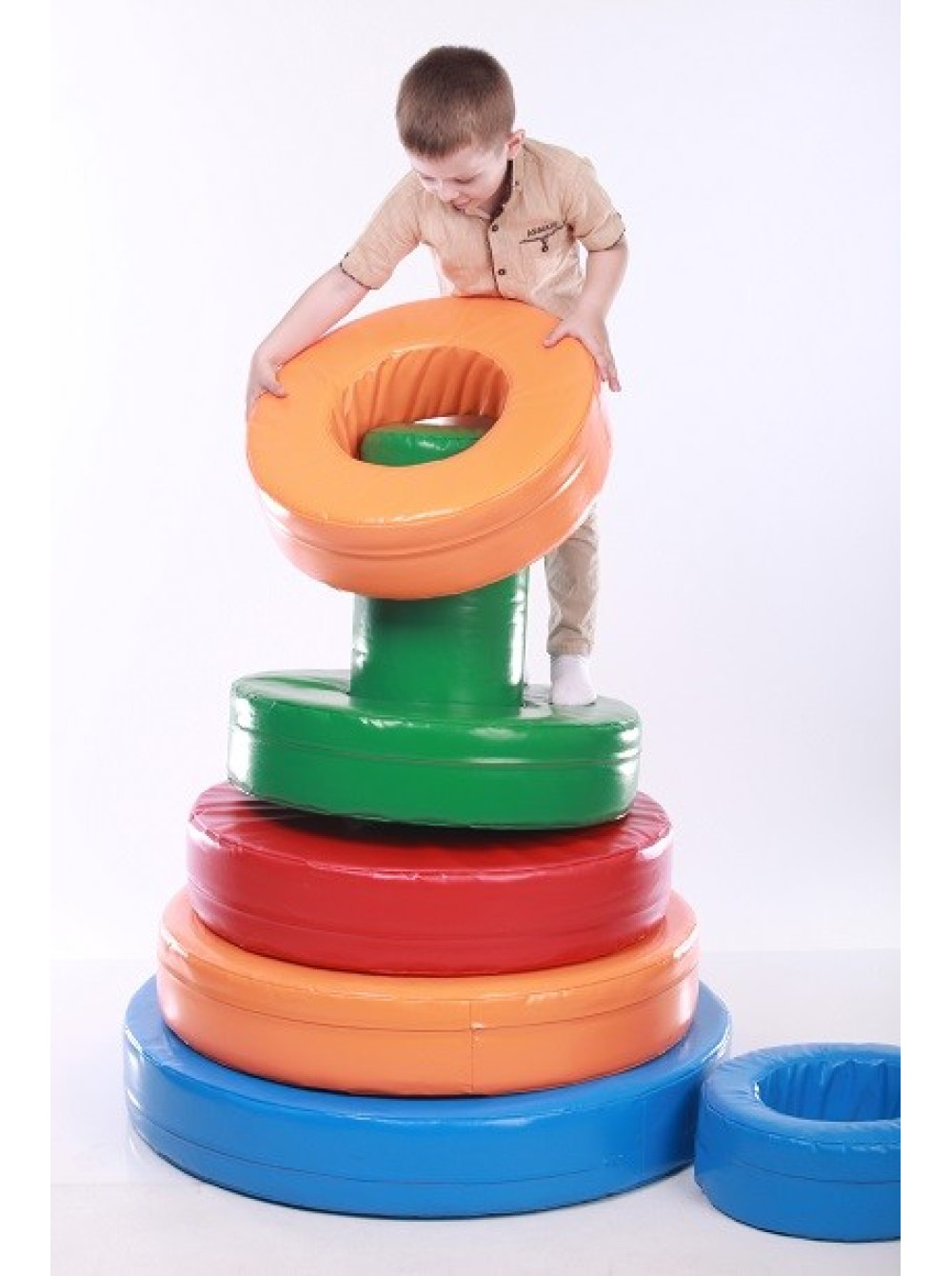 Піраміда з м'яких модулів складається з п'яти фігурних, різноколірних кругів і одного циліндра, які чудово підходять для розвитку простих моторних навичок, ігор і розпізнавання кольорів.