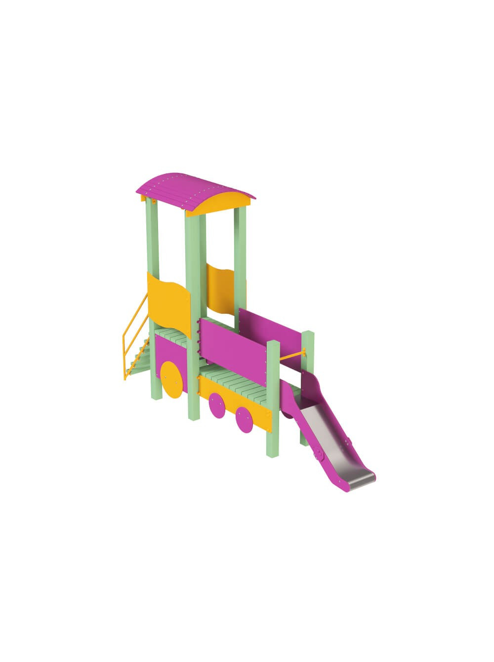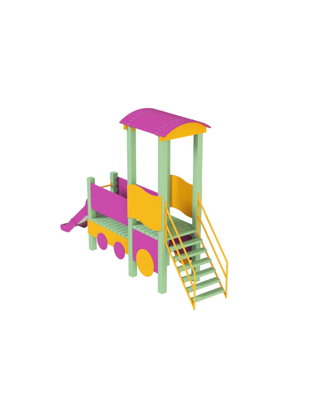 Паровозик з гіркою являє собою дитячий комплекс, який обладнаний маленькою гіркою 0,6 М. Паровозик з гіркою виконаний з вологостійкої фанери, дошки і клеєного бруса. Модель паровоза призначена для використання на вулиці і підходить дітям від 2 до 6 років.