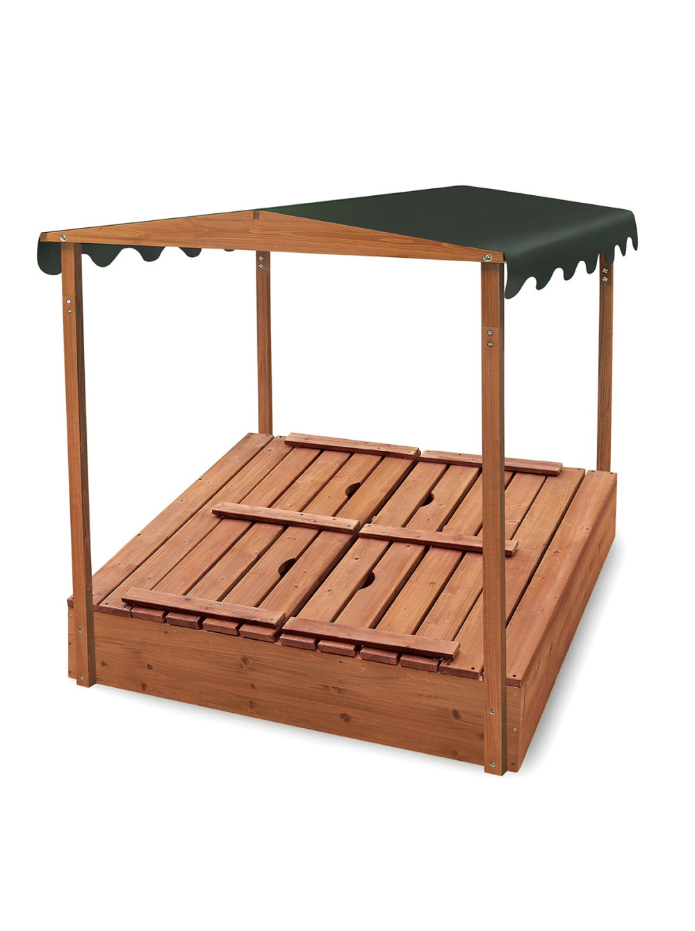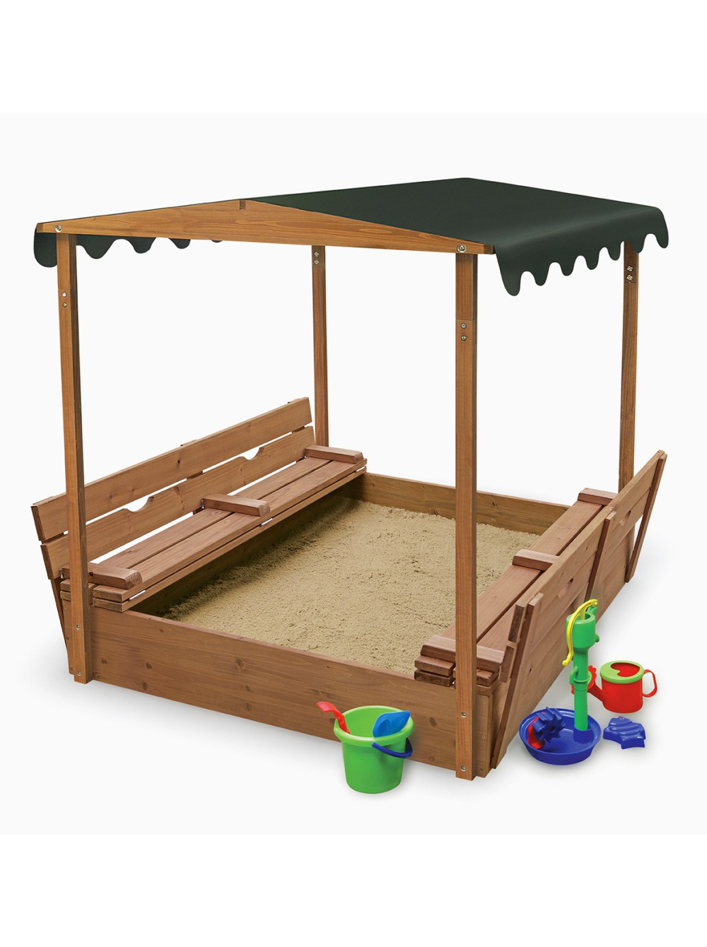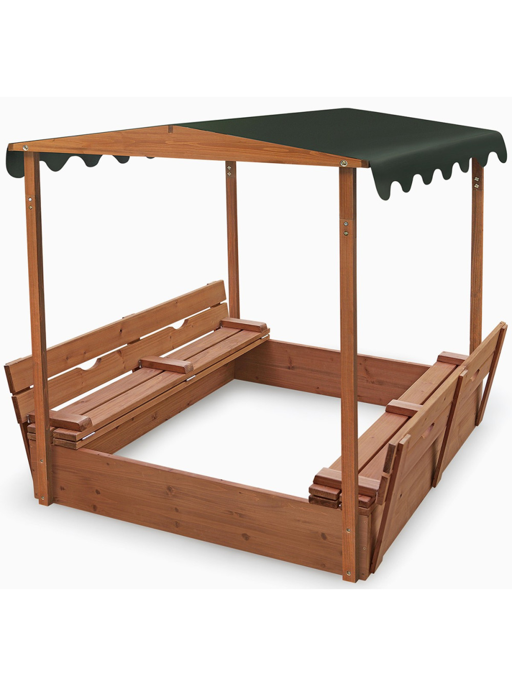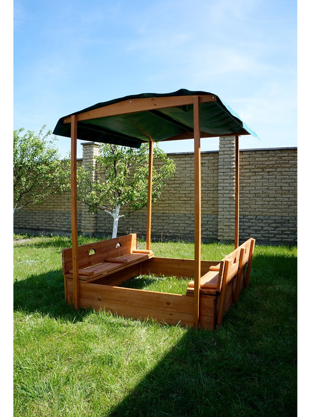 У пісочниці є навіс для захисту від сонця і дві зручні лавки, які при необхідності легко складаються, перетворюючись в кришку і тим самим закриваючи і захищаючи пісок від негоди та інших зовнішніх неприємностей.