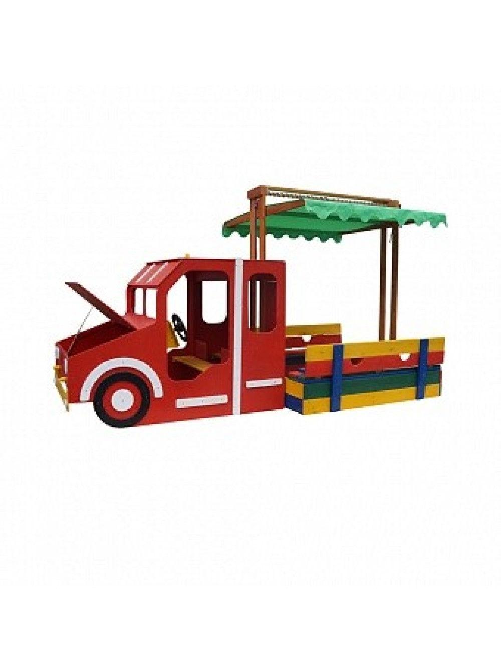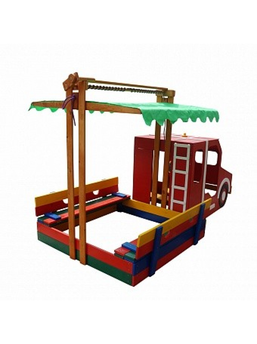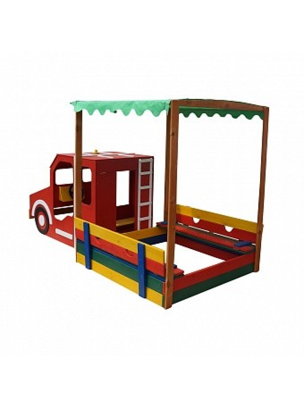 Ігровий комплекс Пожежна машина-пісочниця 145*145 см придуманий і втілений у життя спеціально для таких цілей та ідей. Ігрова зона виконана у вигляді спеціальної машини для гасіння пожеж з причепом з пісочниці з кришкою, яка при відкритті трансформується в дві лавочки. Пісочниця розташовується під тентованим дахом, тому легкі несприятливі погодні умови (вітер та дощ), а також сонячні промені не завадять ігровому дозвіллю малечі. В кабіні машинки є лавка і дітлахи зможуть грати в тематичні ігри водіїв, пішоходів і пожежників.