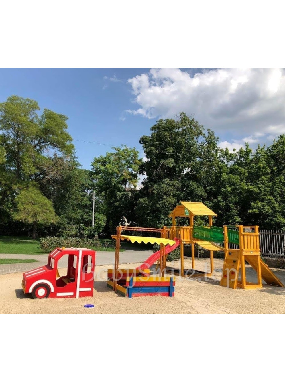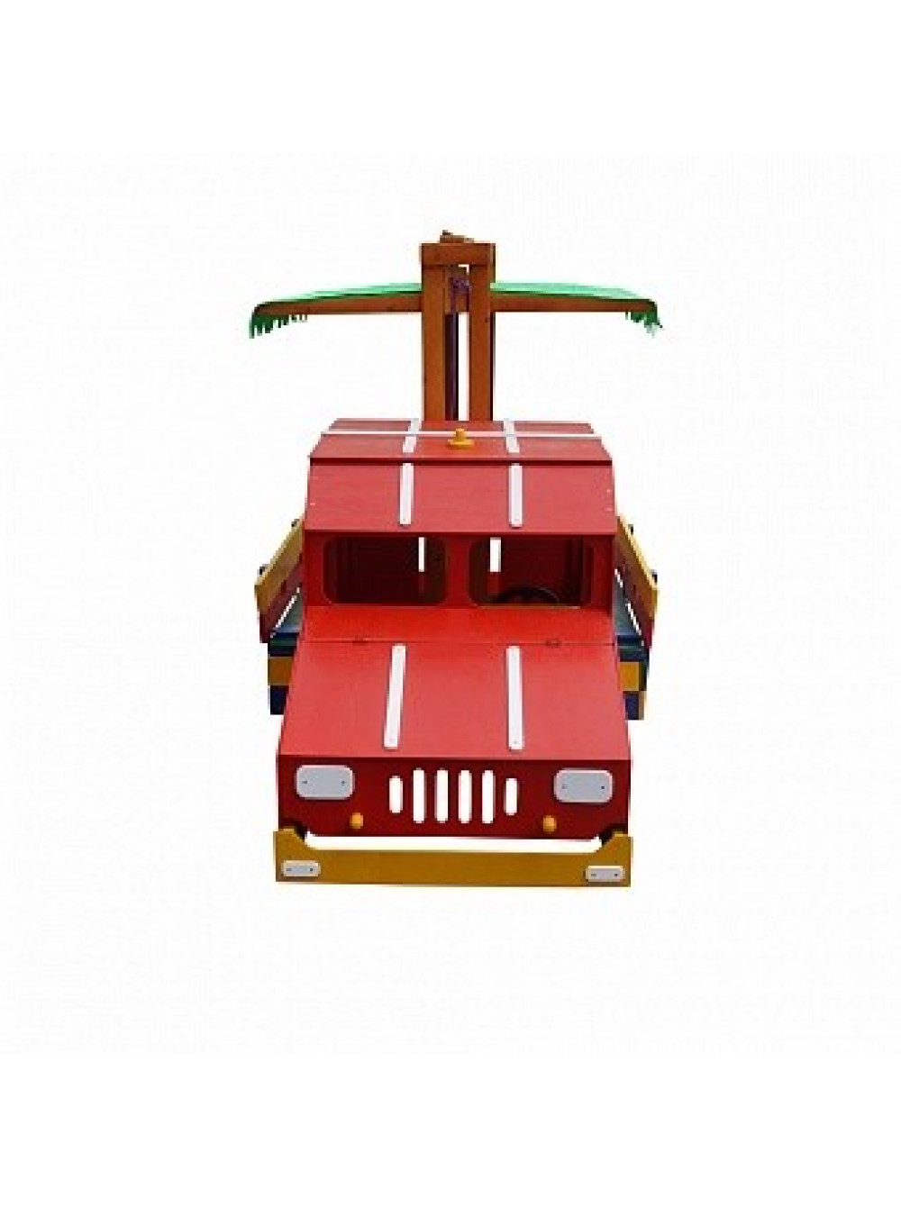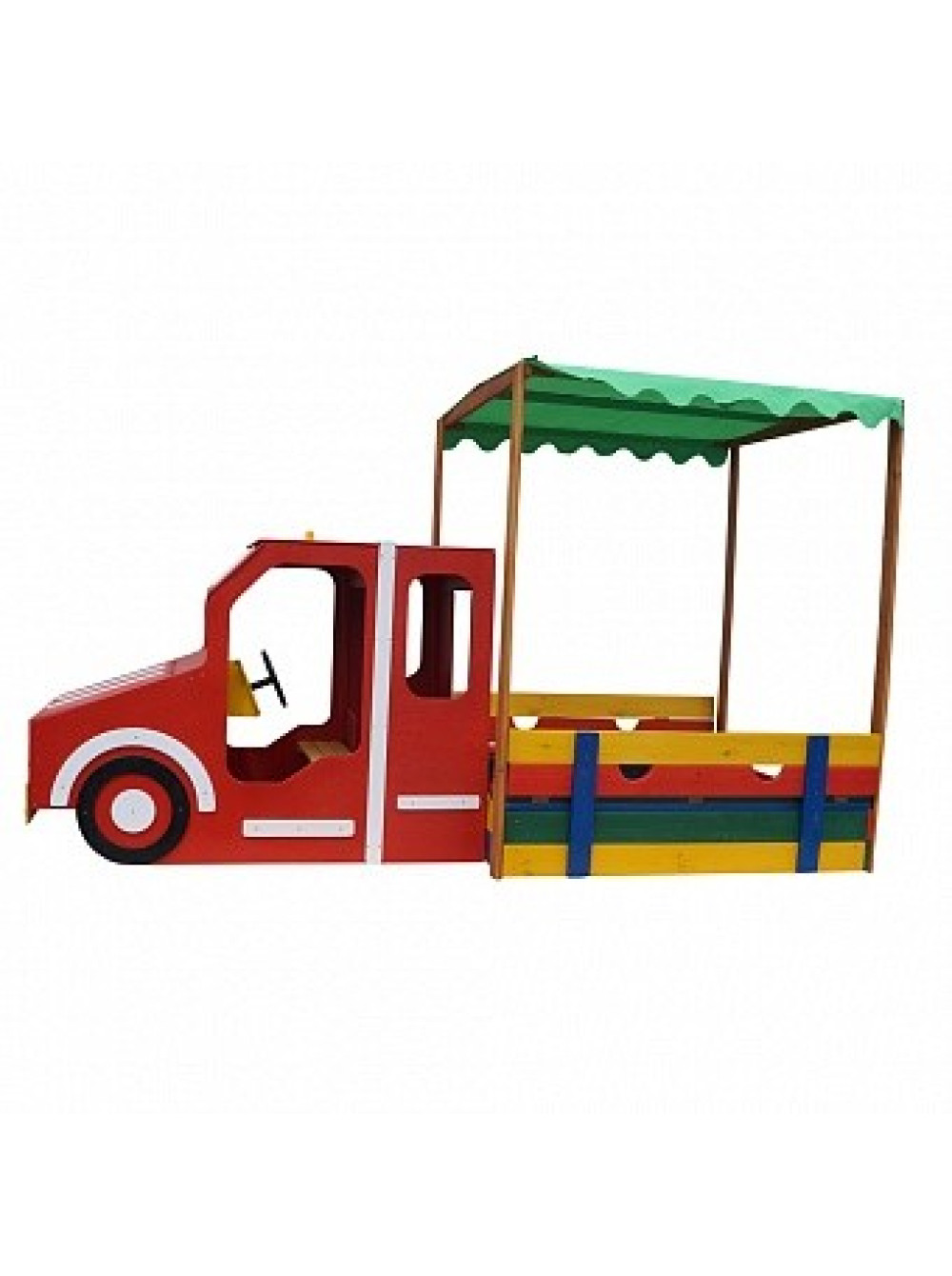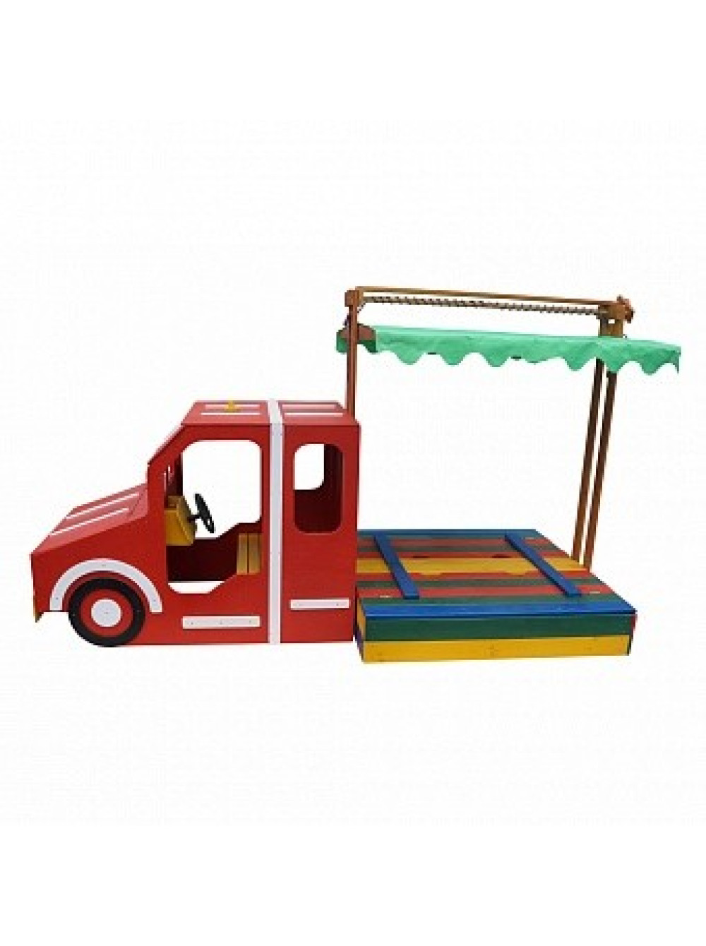 Ігровий комплекс Пожежна машина-пісочниця 145*145 см придуманий і втілений у життя спеціально для таких цілей та ідей. Ігрова зона виконана у вигляді спеціальної машини для гасіння пожеж з причепом з пісочниці з кришкою, яка при відкритті трансформується в дві лавочки. Пісочниця розташовується під тентованим дахом, тому легкі несприятливі погодні умови (вітер та дощ), а також сонячні промені не завадять ігровому дозвіллю малечі. В кабіні машинки є лавка і дітлахи зможуть грати в тематичні ігри водіїв, пішоходів і пожежників.