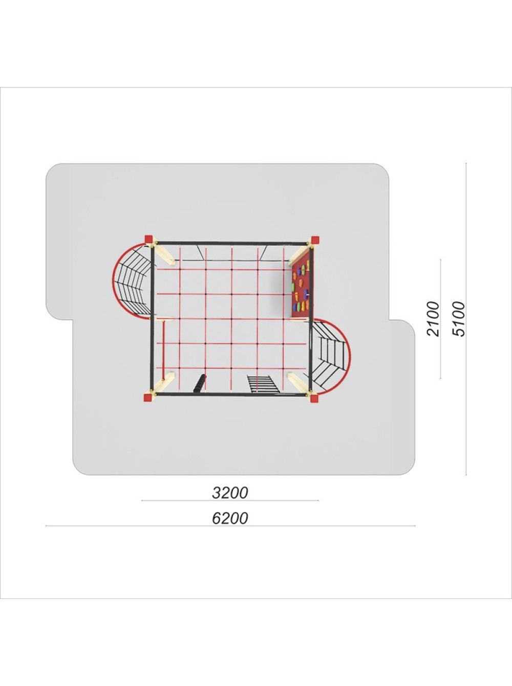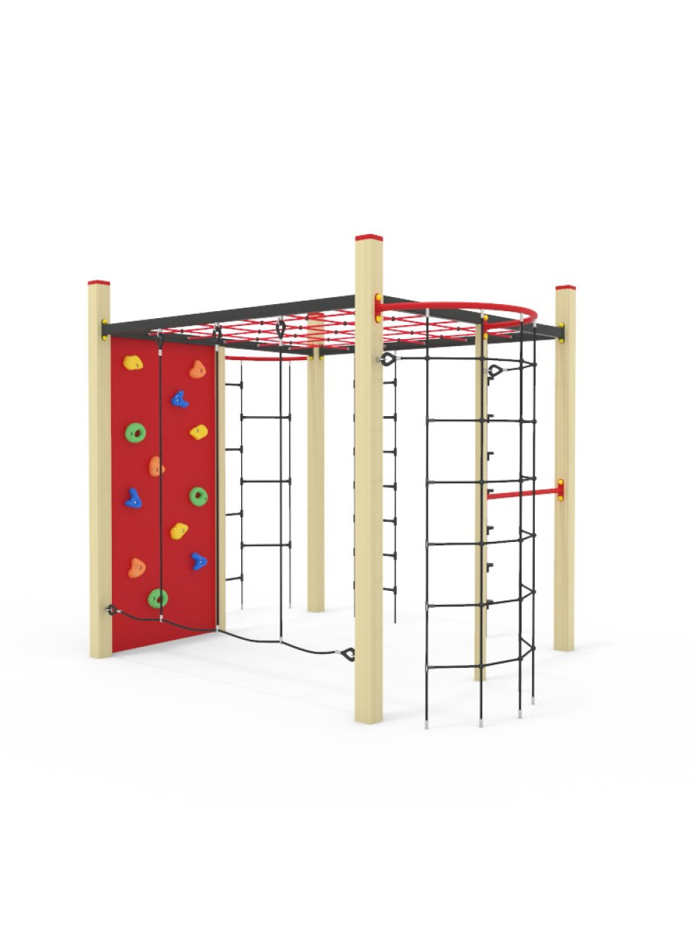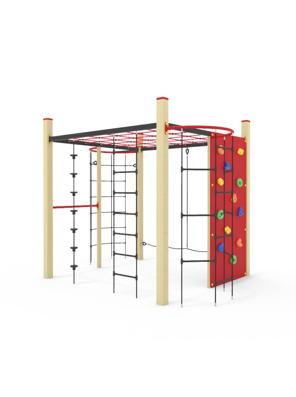 Спортивний канатний комплекс вуличний-1. Такі споруди дуже популярні для розміщення на дитячих майданчиках. Ігровий комплекс включає в себе різноманітні сітки для лазіння та скеледром, з усього цього можна створити цілі альпіністські траси. які перетворюють час гри в захоплювальну і складну пригоду.