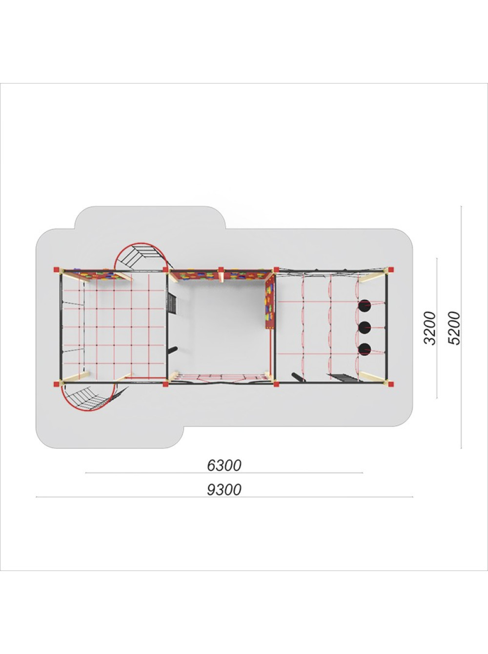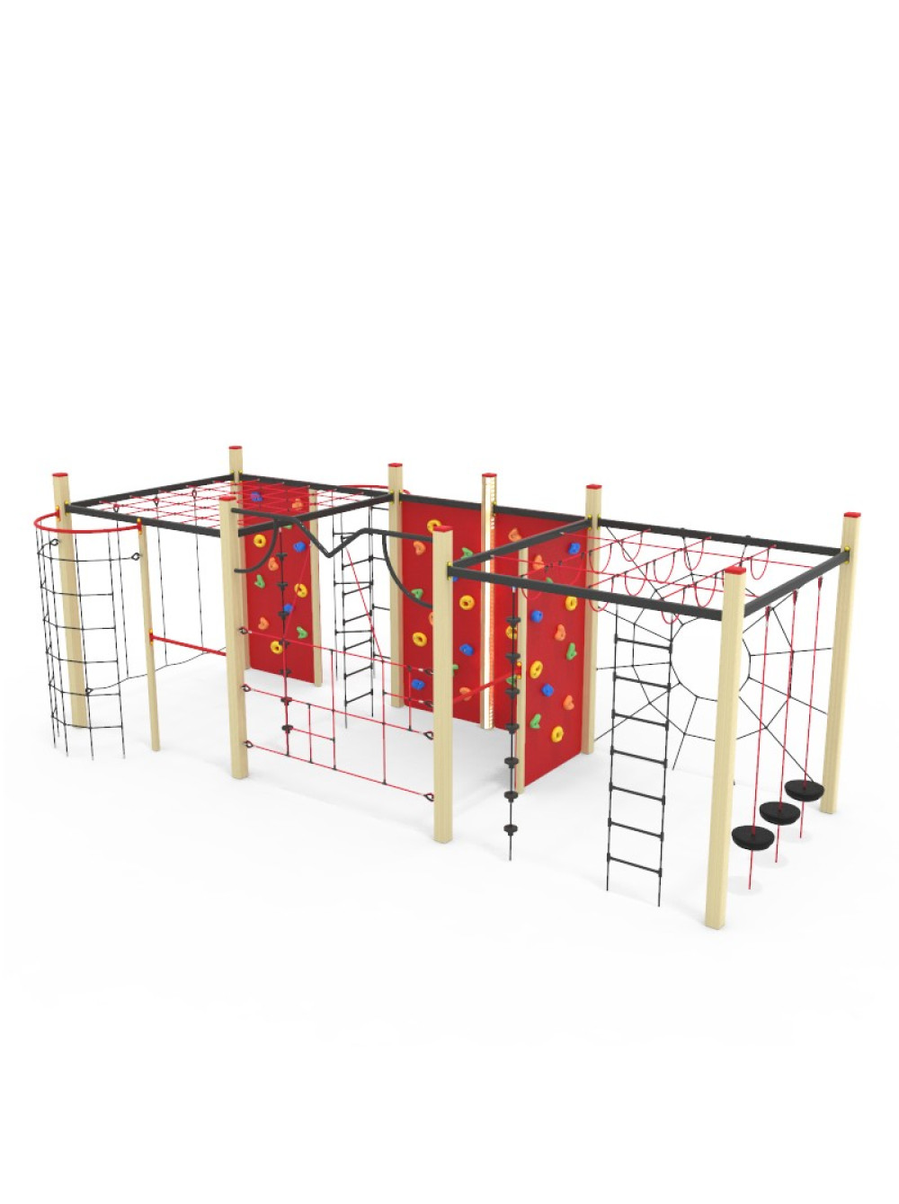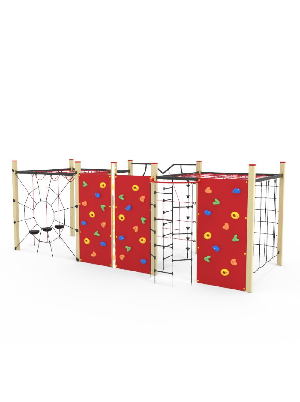 Спортивний канатний комплекс вуличний-2. Такі споруди дуже популярні для розміщення на дитячих майданчиках. Ігровий комплекс включає в себе різноманітні сітки для лазіння та скеледром, з усього цього можна створити цілі альпіністські траси. які перетворюють час гри в захоплювальну і складну пригоду.