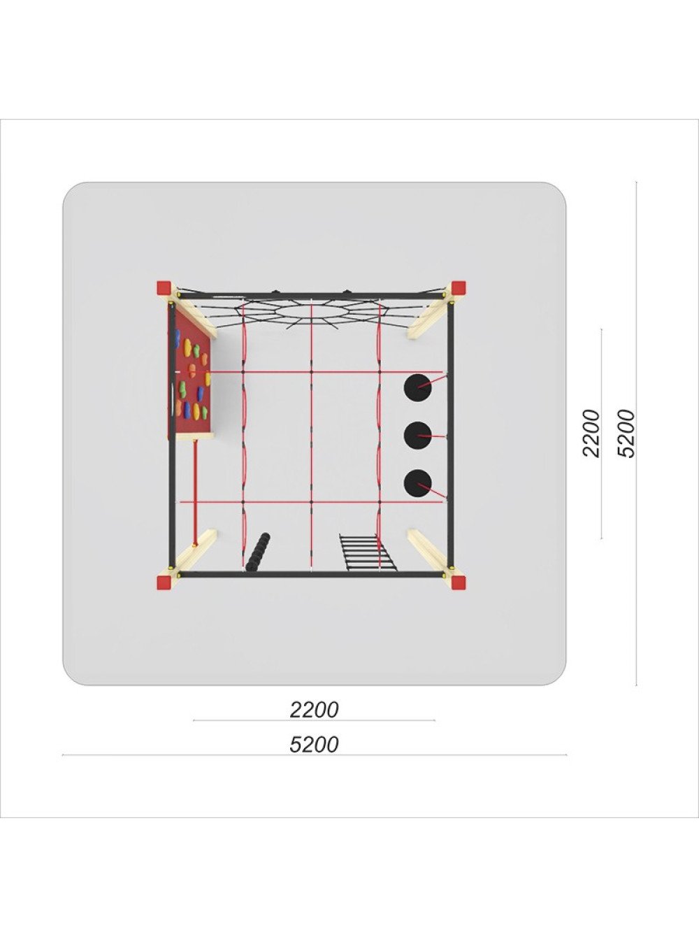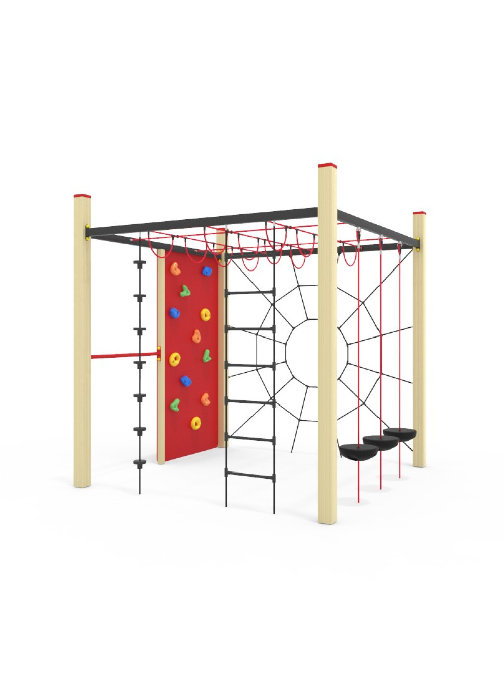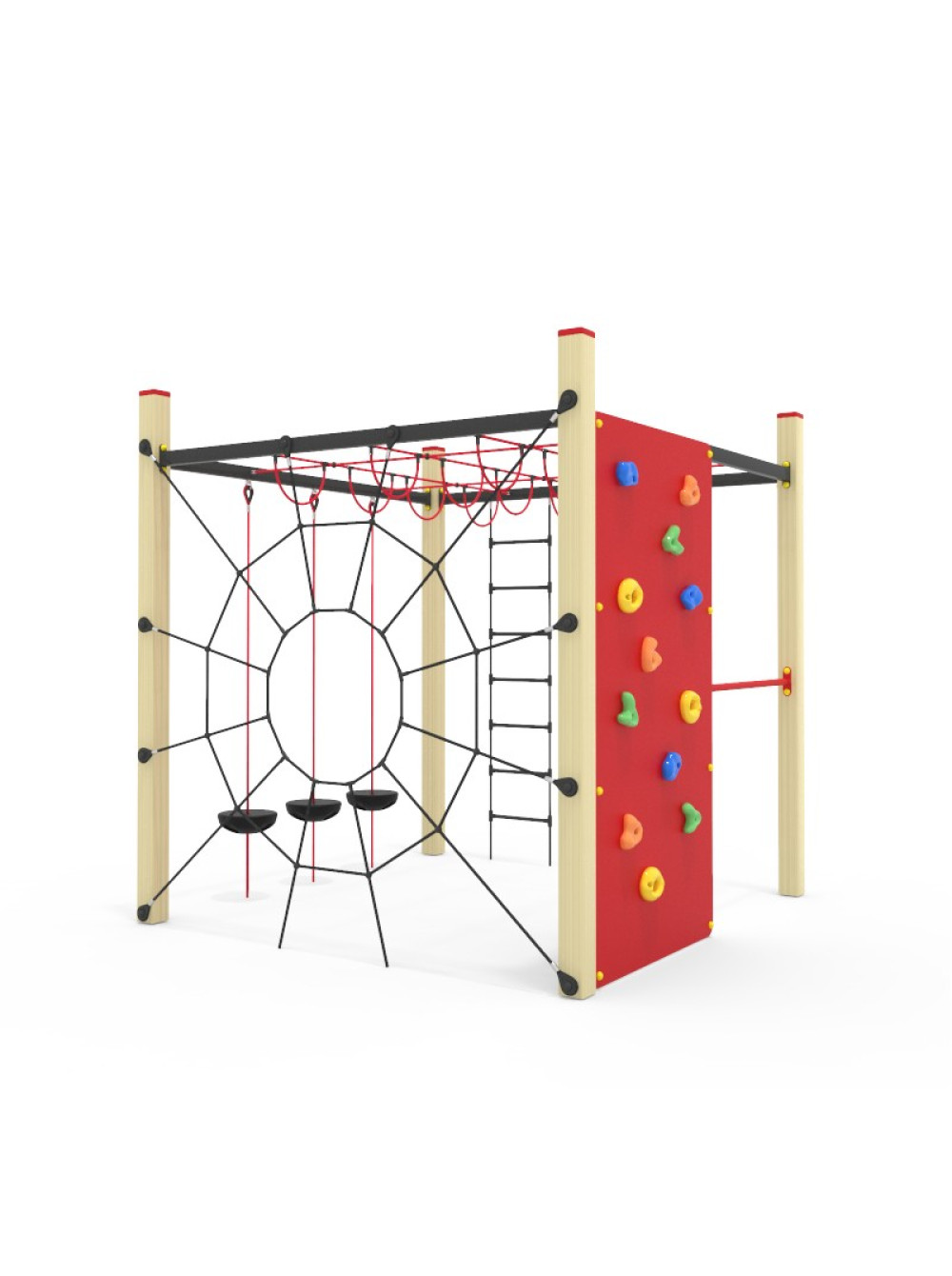 Спортивний канатний комплекс вуличний. Такі споруди дуже популярні для розміщення на дитячих майданчиках. Ігровий комплекс включає в себе різноманітні сітки для лазіння та скеледром, з усього цього можна створити цілі альпіністські траси. які перетворюють час гри в захоплювальну і складну пригоду.