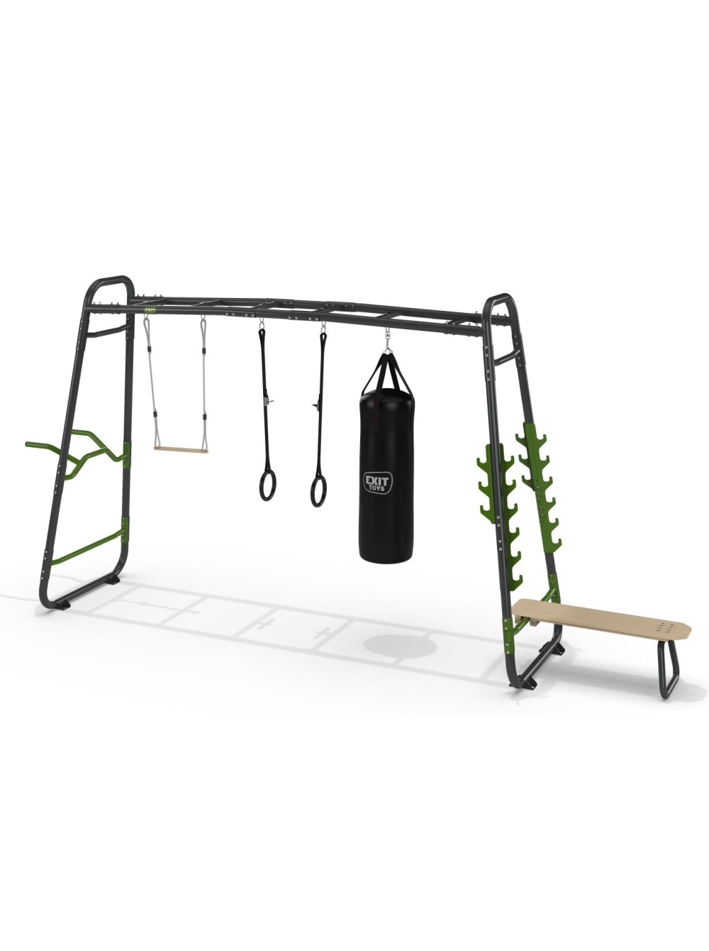 Воркаут для дітей і дорослих Exit GetSet MB330 — чудовий спортивний комплекс для ігор і фітнесу на вулиці. До комплектації входять такі аксесуари: турнік-планка, трапеція, бруси, кільця для кріплення силового каната, боксерська груша, пластикові гімнастичні кільця, лава для жима, тримачі для штанги.