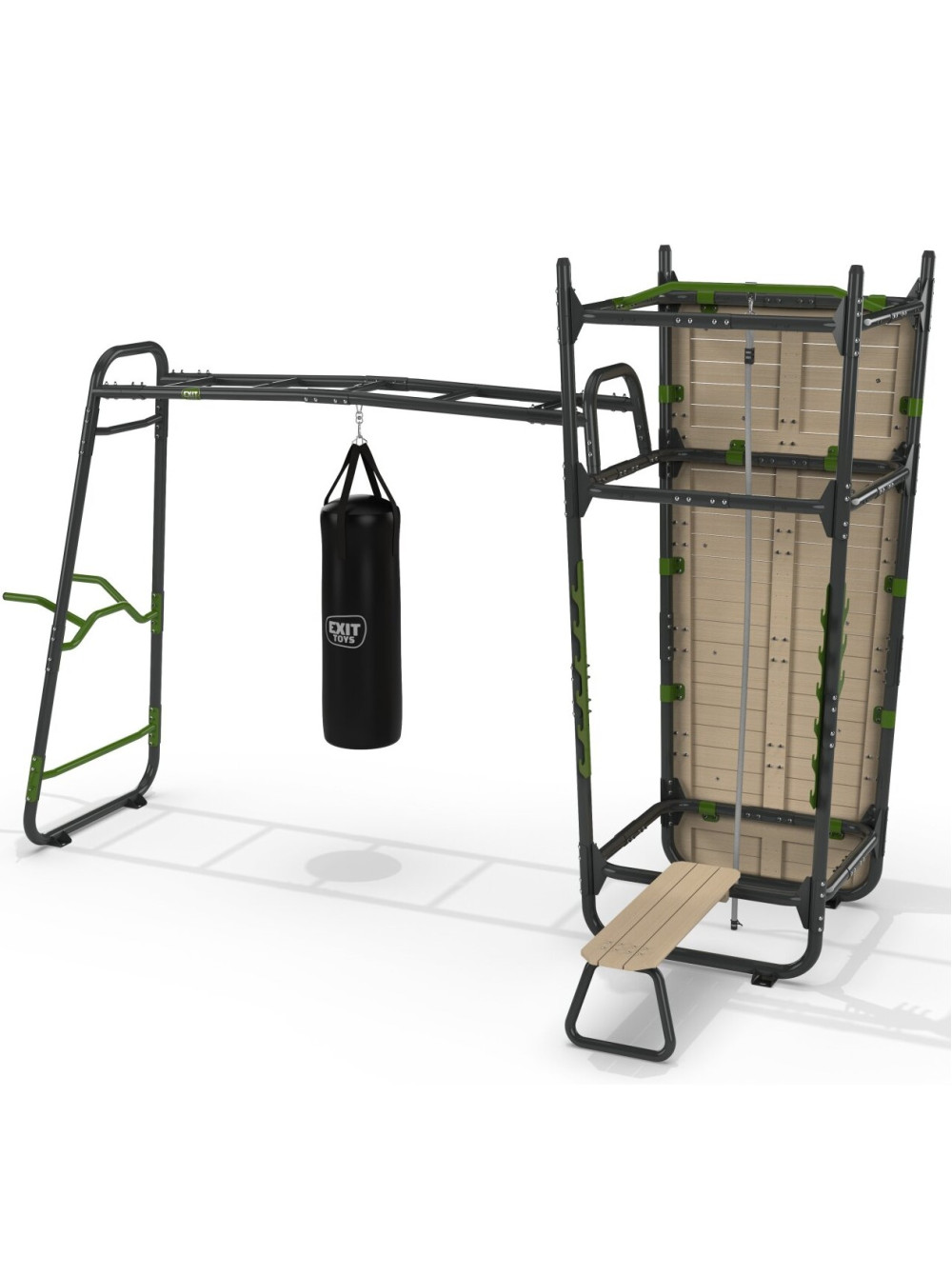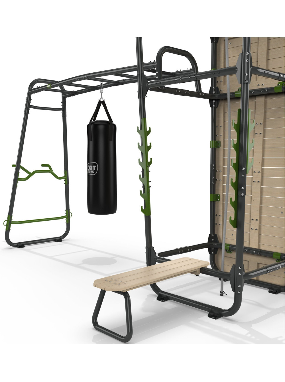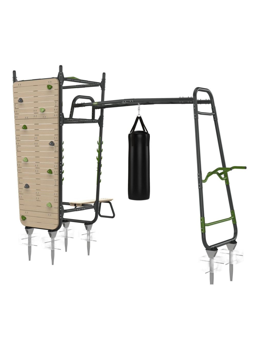 Воркаут для дітей і дорослих Exit GetSet MB520 - чудовий спортивний комплекс для ігор і фітнесу на вулиці. До комплектації входять такі аксесуари: турнік-планка, бруси, турнік для підтягувань, дошка для скелелазіння, кільця для кріплення силового каната, боксерська груша, канат, лава для жима, тримачі для штанги. Ви самостійно можете додати потрібні аксесуари. Він багатофункціональний, підійде для занять спортом і розваг дорослим і дітям.