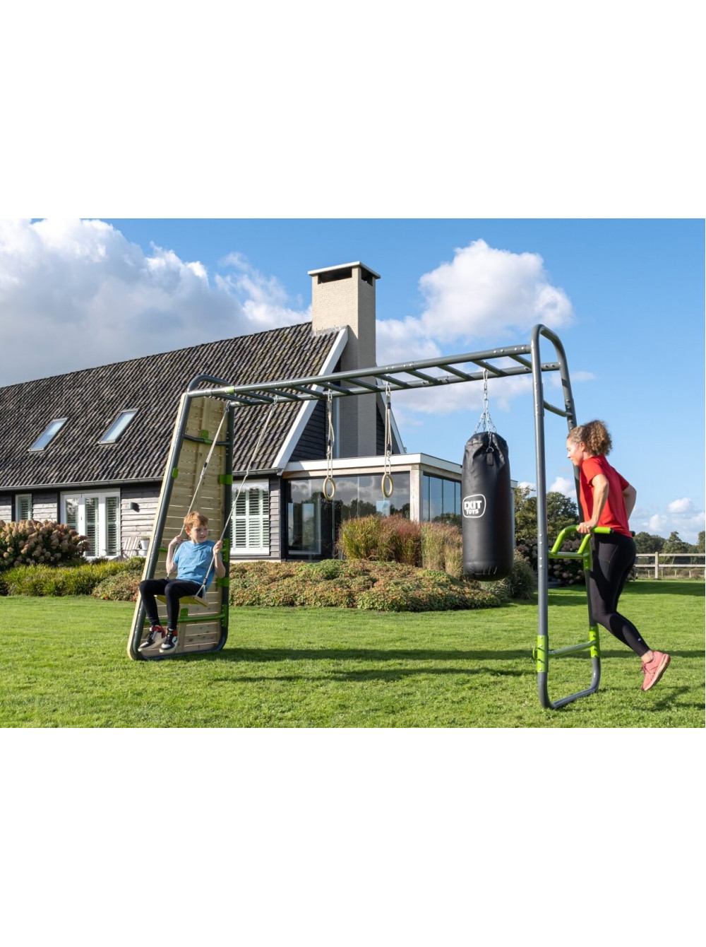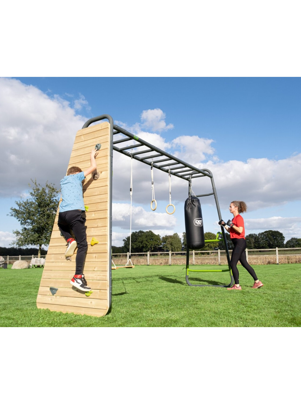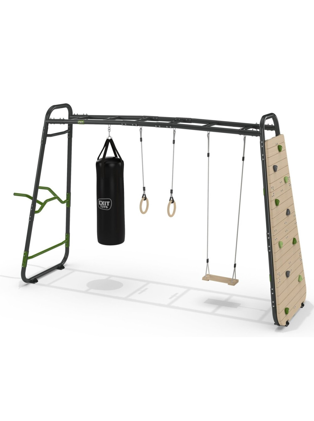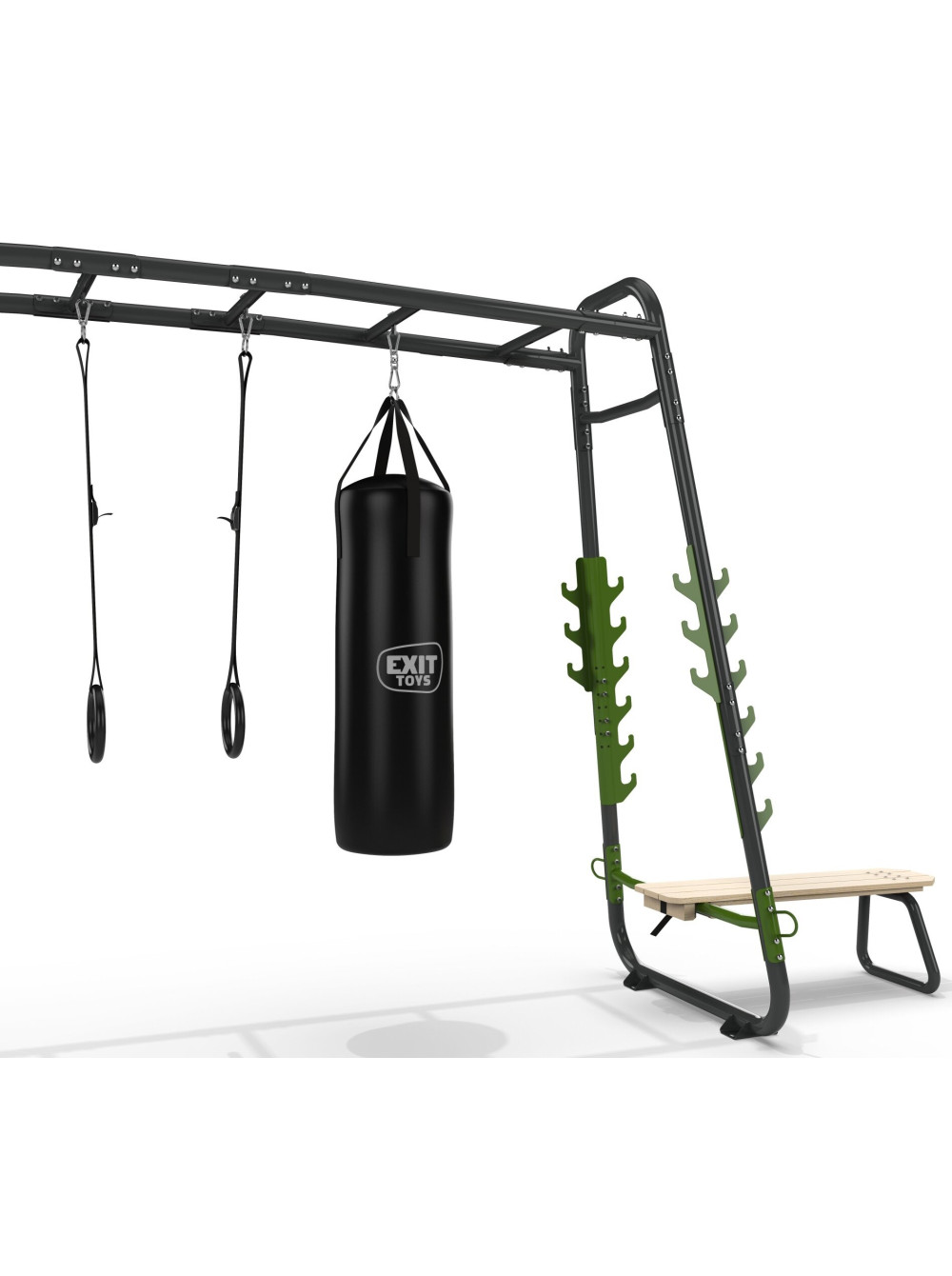Воркаут Exit GetSet MB320 — чудовий спортивний комплекс для ігор і фітнесу на вулиці. До комплектації входять такі аксесуари: турнік-планка, бруси, кільця для кріплення каната, боксерська груша, дерев'яні гімнастичні кільця, дошка для скелелазіння. Ви самостійно можете додати потрібні аксесуари.