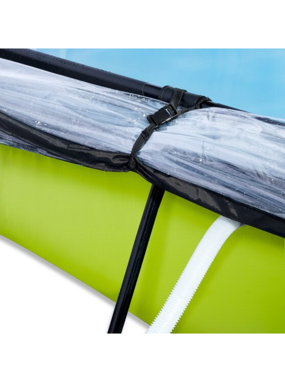 Виріб виглядає сучасно і стильно, із зовнішнього боку - тканина із забарвленням "лайм", що робить його розміщення в саду, на дачі або у дворі частки будинку особливо привабливим. Усередині - покриття синього кольору, що створює відчуття свіжості і прохолоди. Басейн EXIT оснащений тришаровими стінами, виготовленими з ПВХ і поліестеру.