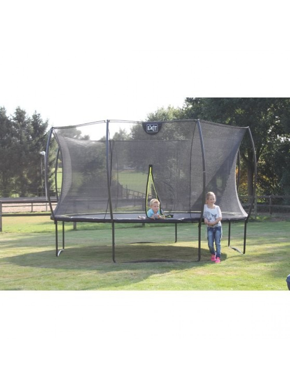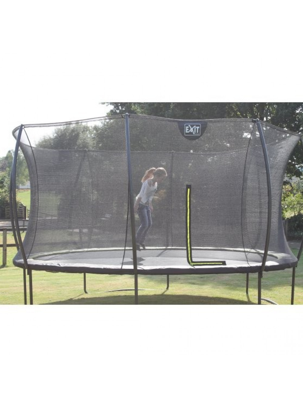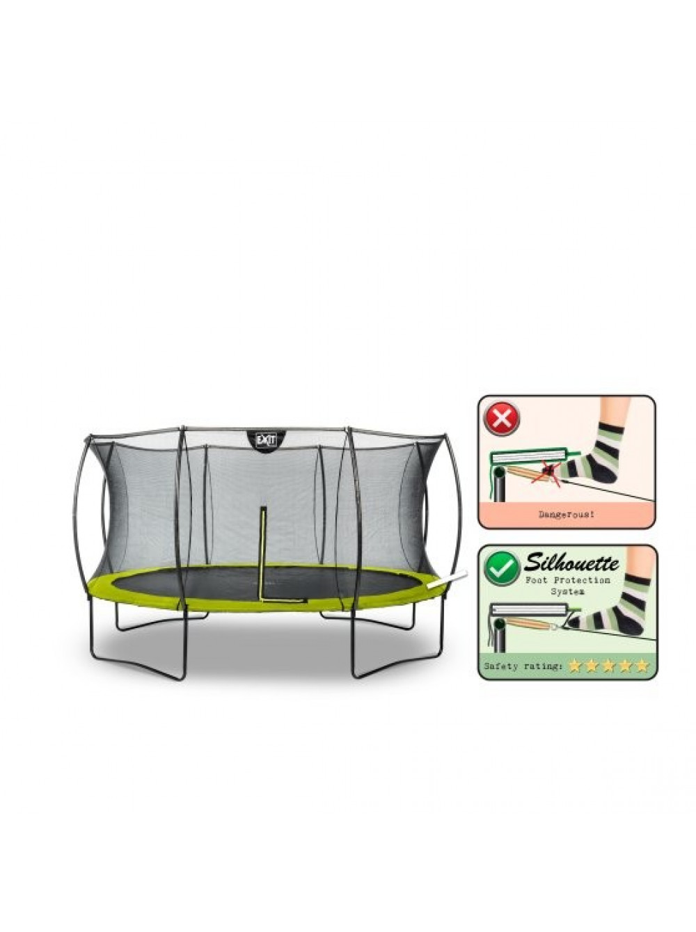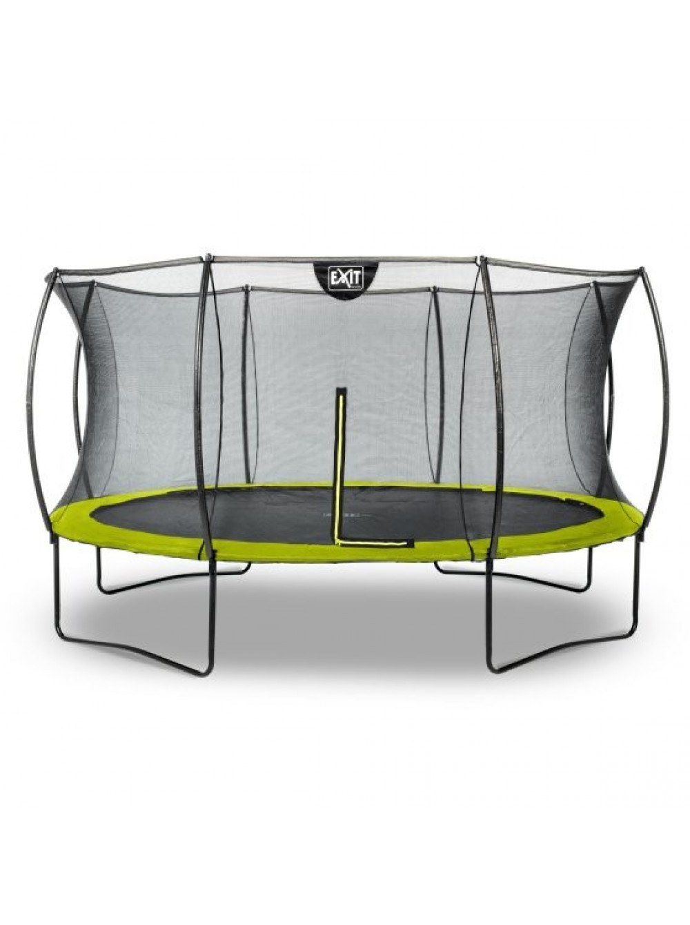 Батут Exit SILHOUETTE 427 - гарний, надійний, довговічний, сучасний і прекрасно розроблений, без сумнівів, буде чудово виглядати в будь-якому саду або дворі будинку. Конструкція досить стійка і поставляється в комплекті з захисною сіткою, яка зручно відкривається за допомогою блискавки. Батут має контрастний чорний матовий колір з включенням яскраво-зелених акцентів, що робить його елегантним і привабливим.