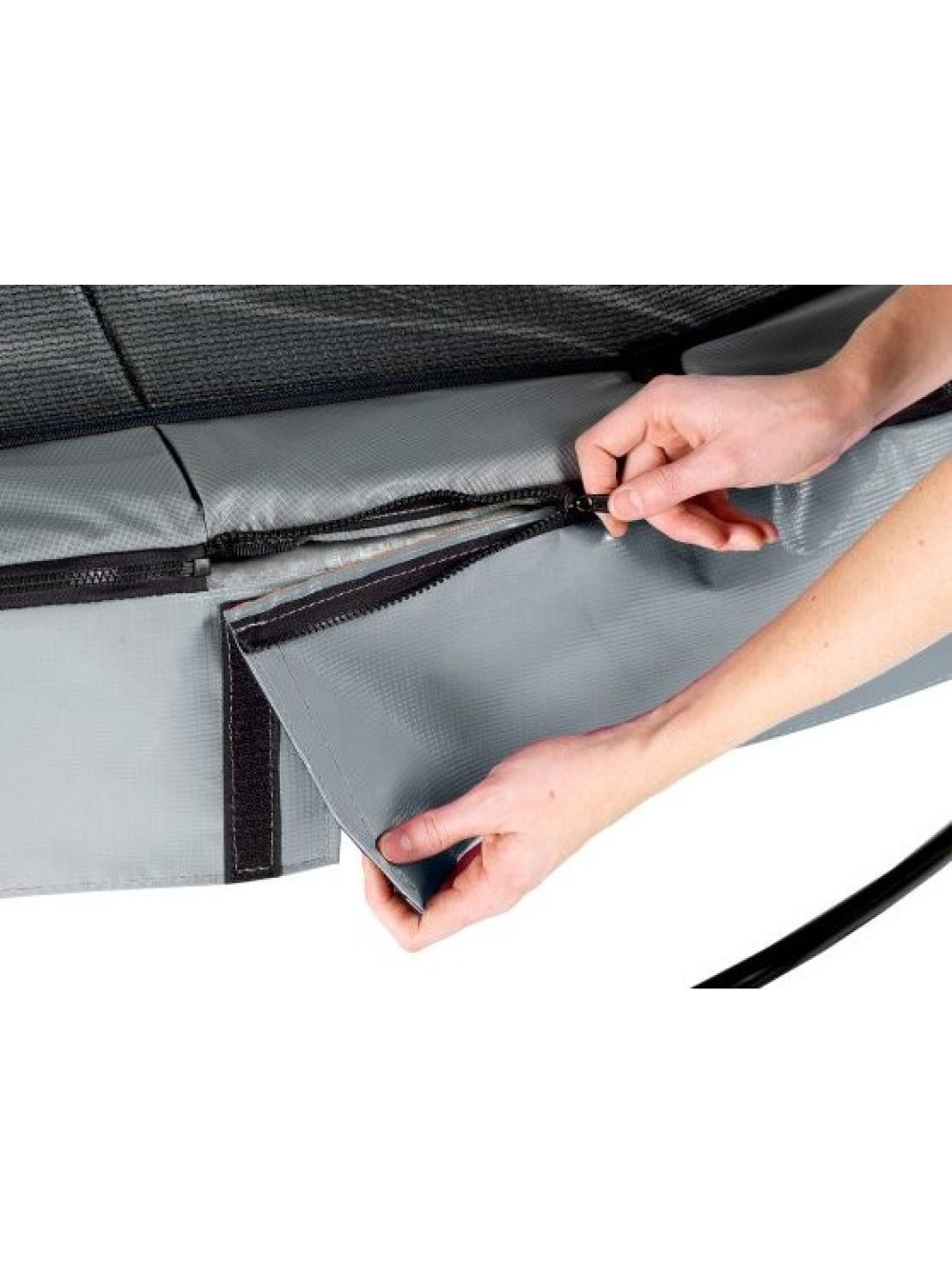 Інноваційна система кріплення полегшує і прискорює час на складання рами в порівнянні з іншими батутами. Сіру спідницю можна швидко прикріпити до захисного краю за допомогою блискавки. Захисна накладка міцна і має систему захисту ніг (FPS), який був спеціально розроблений компанією EXIT Toys для відвертання попадання ваших ніг в пружини при підстрибуванні. Впродовж короткого часу батут готовий до використання, так чого ж ви чекаєте?