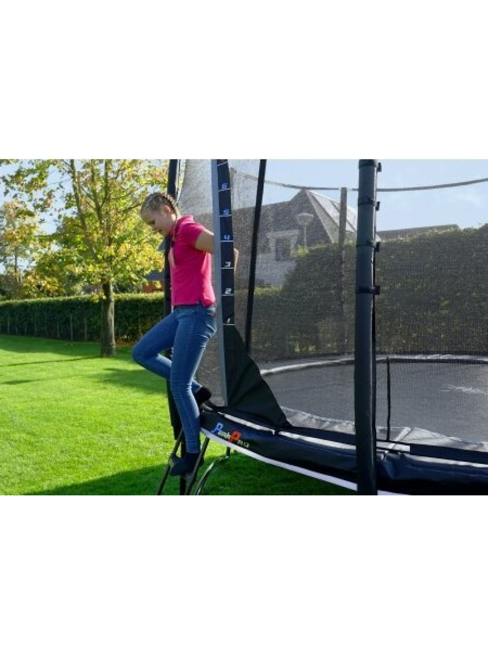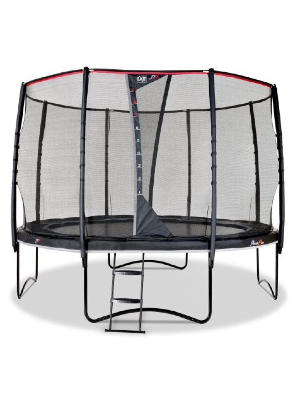 Батут EXIT PeakPro 305 см чорний із захисною сіткою - це круглий батут преміум класу із захистом на пружини чорного кольору, матом для стрибків і пружинами, які в комплексі забезпечують першокласні і комфортні стрибки. Батут має шикарний і статусний зовнішній вигляд, його рама чорного кольору доповнена тонкими колірними деталями та обідком, що відбиває світло. Такий батут стане справжньою перлиною навіть в найдорожчому екстер'єрі заміського будинку. Сходи для батута включені в комплект, щоб ви могли швидко і безпечно піднятися на батут.
