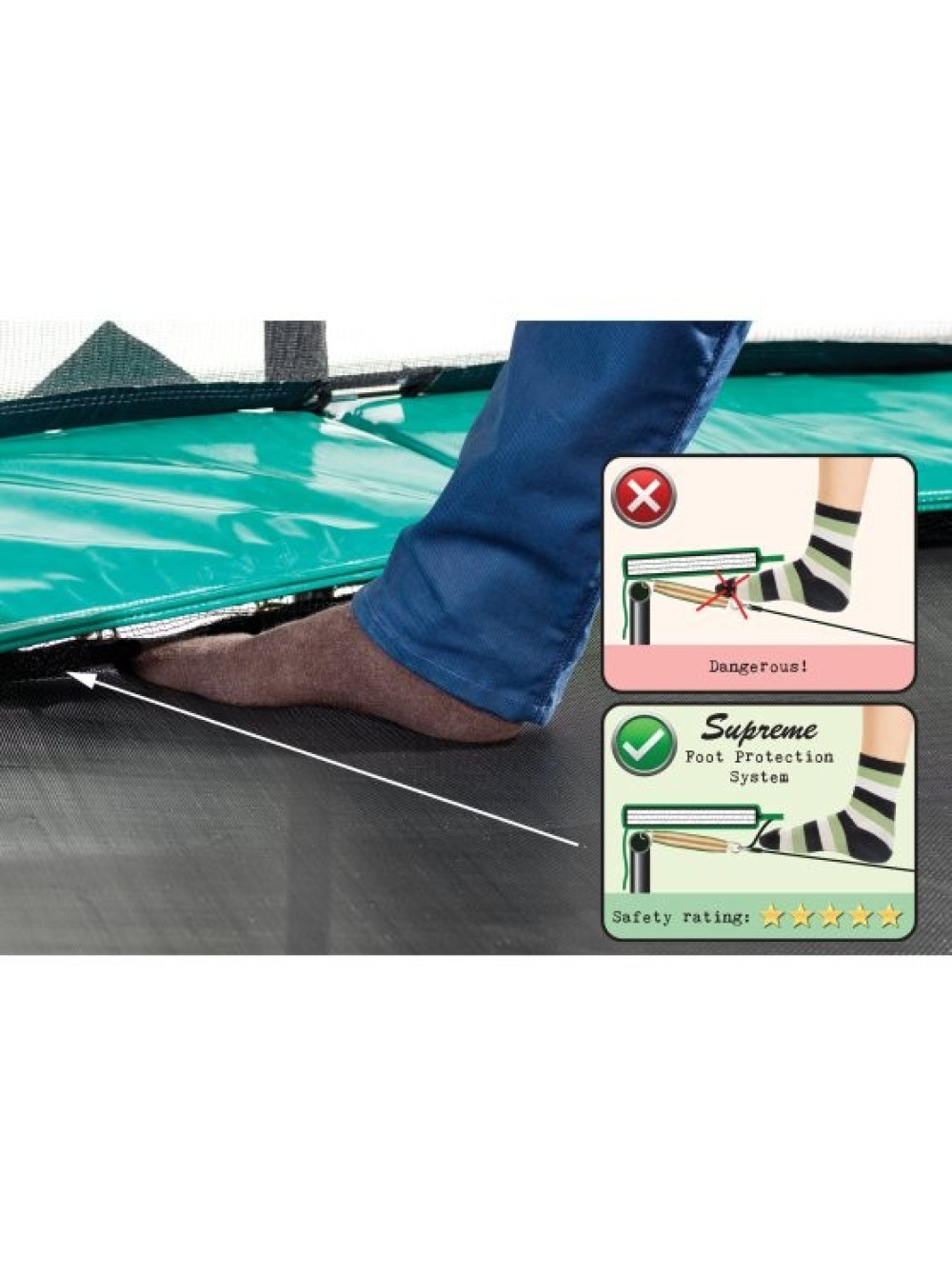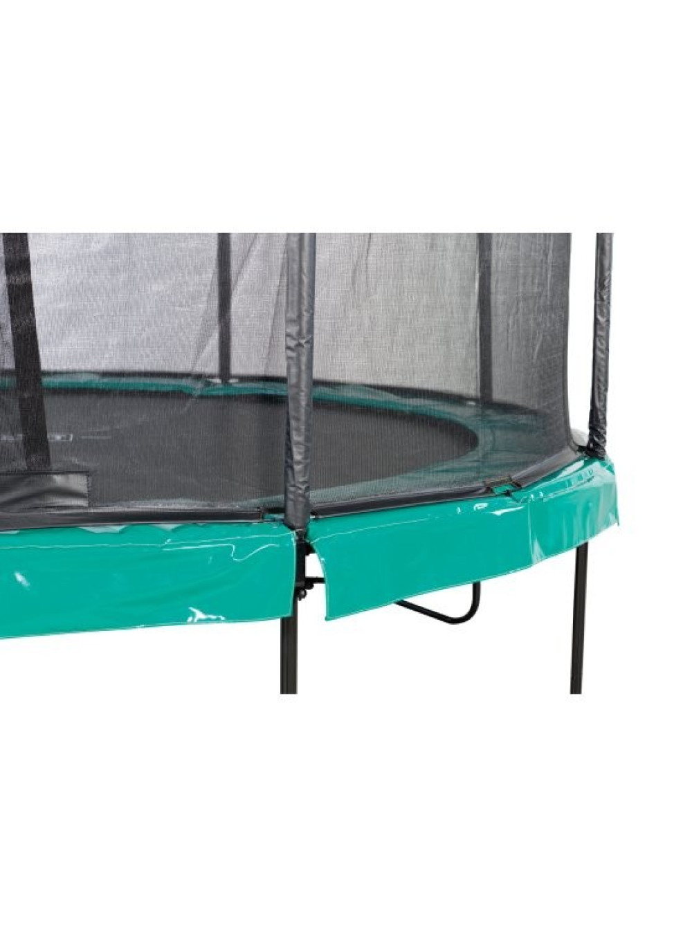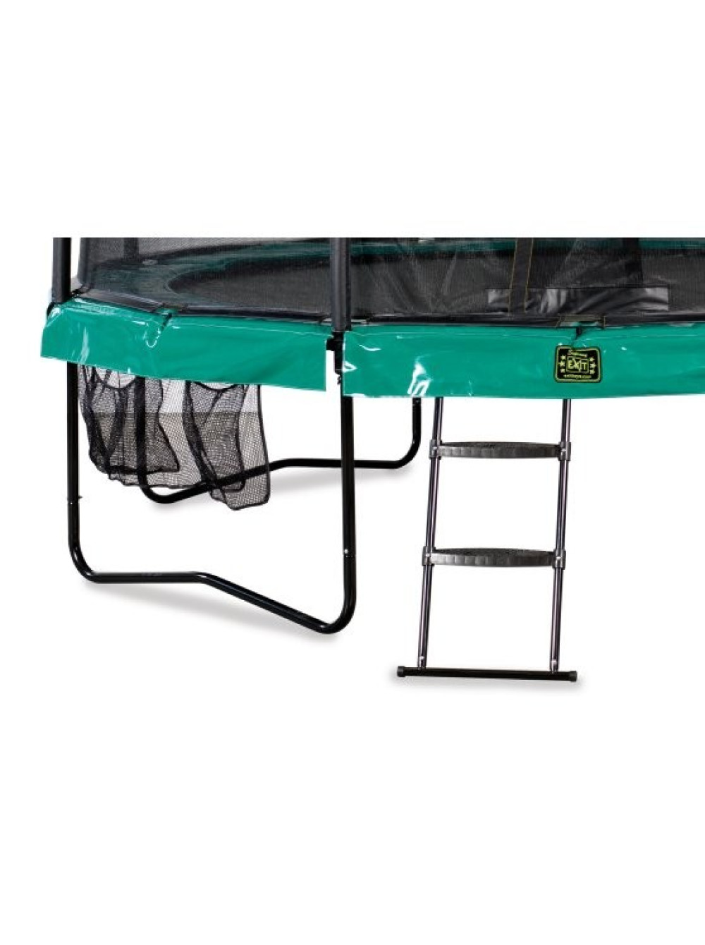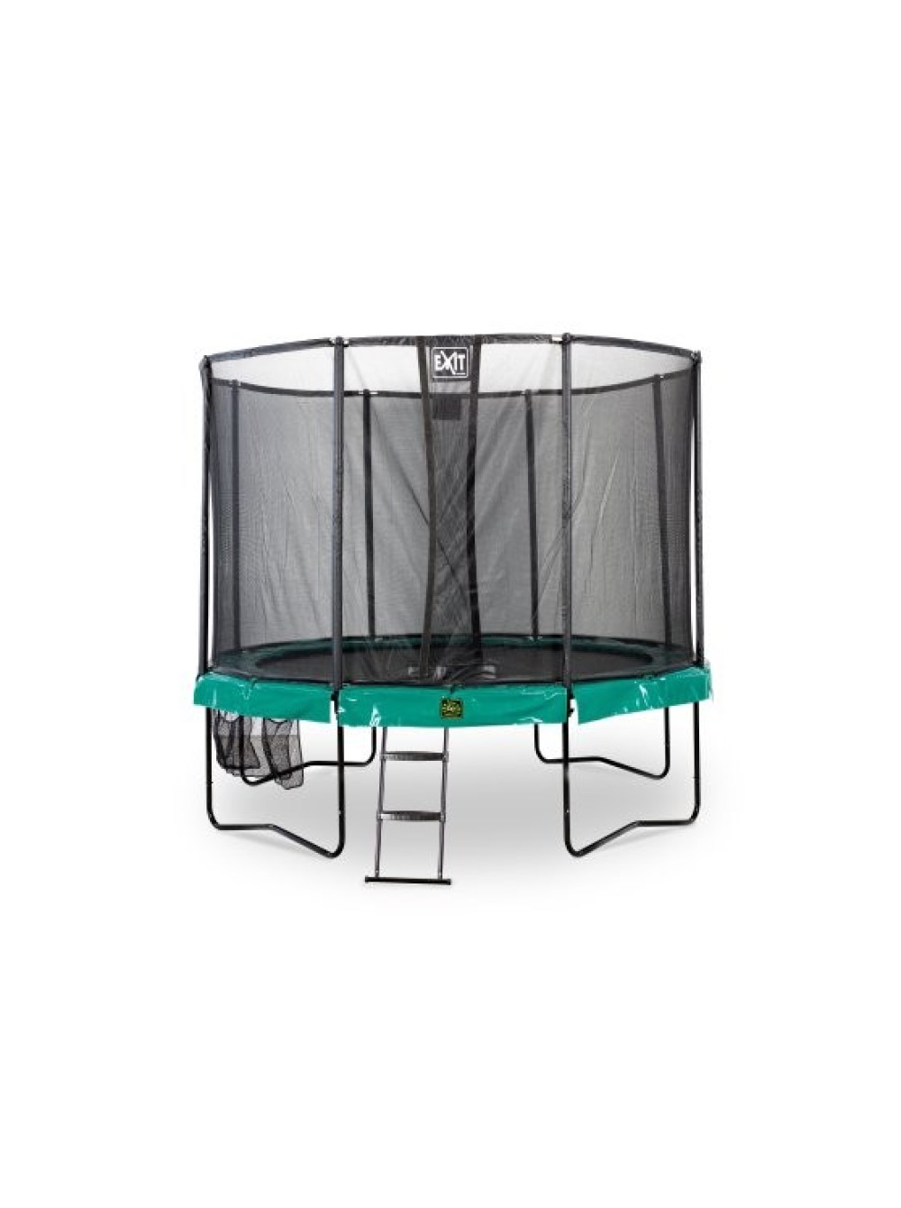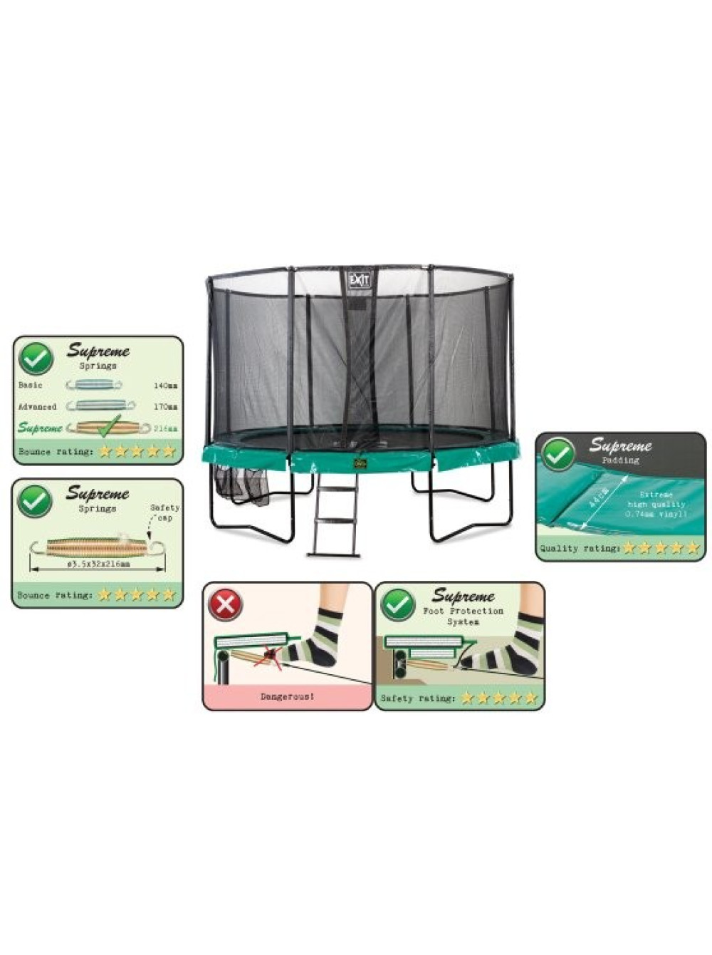Батут EXIT Supreme 305 см з драбинкою і сумкою для взуття круглої форми із захисною кромкою зеленого кольору. Батут на металевих опорах, стандартно поставляється з сіткою безпеки з входом для дітей.