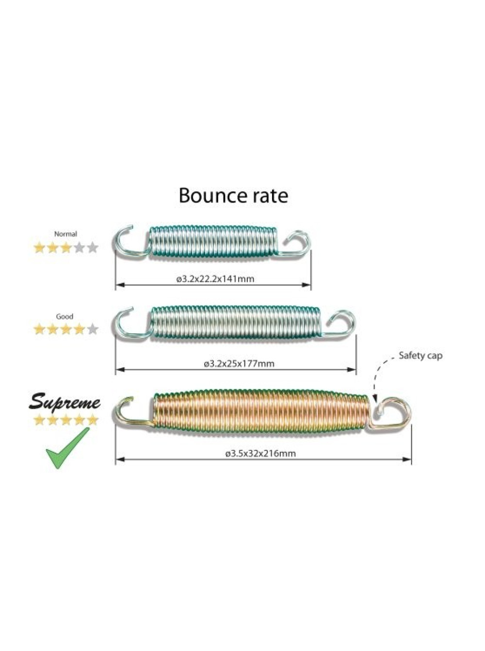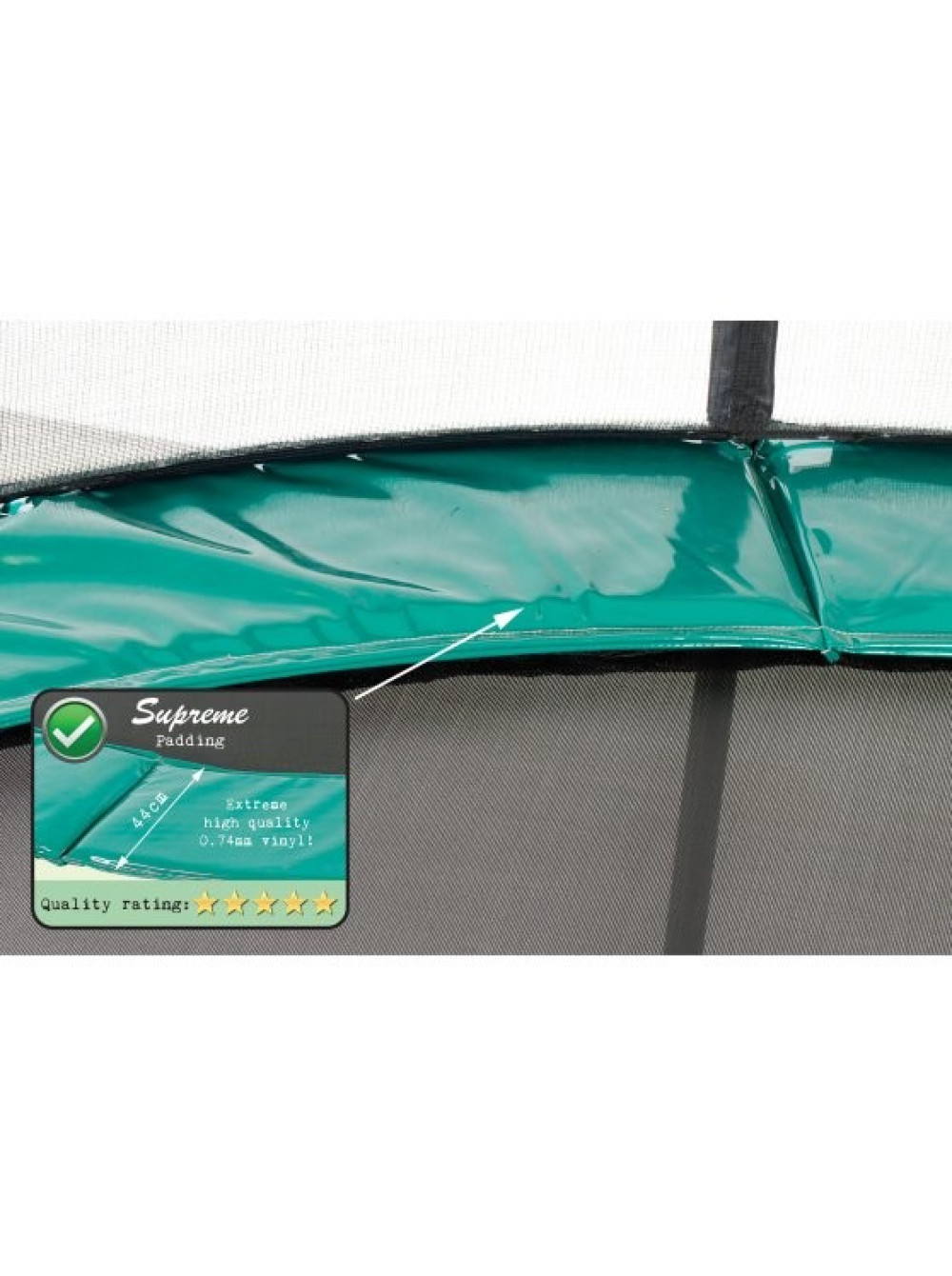 Цей батут не лише красивий і якісний, але і довговічний. Захисна кромка стійка до ультрафіолетового випромінювання, а рама оцинкована, а потім покрита порошковою фарбою, щоб у іржі не було жодних шансів. EXIT Supreme знаходиться в класі з оптимальним комфортом стрибків!