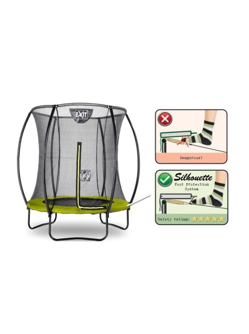 Високоякісна накладка повністю покриває оцинковані пружини і має спеціально розроблену систему безпеки для ніг, яка запобігає потраплянню ніг на пружини. Міцні пружини гарантують відмінну стрибкову активність.