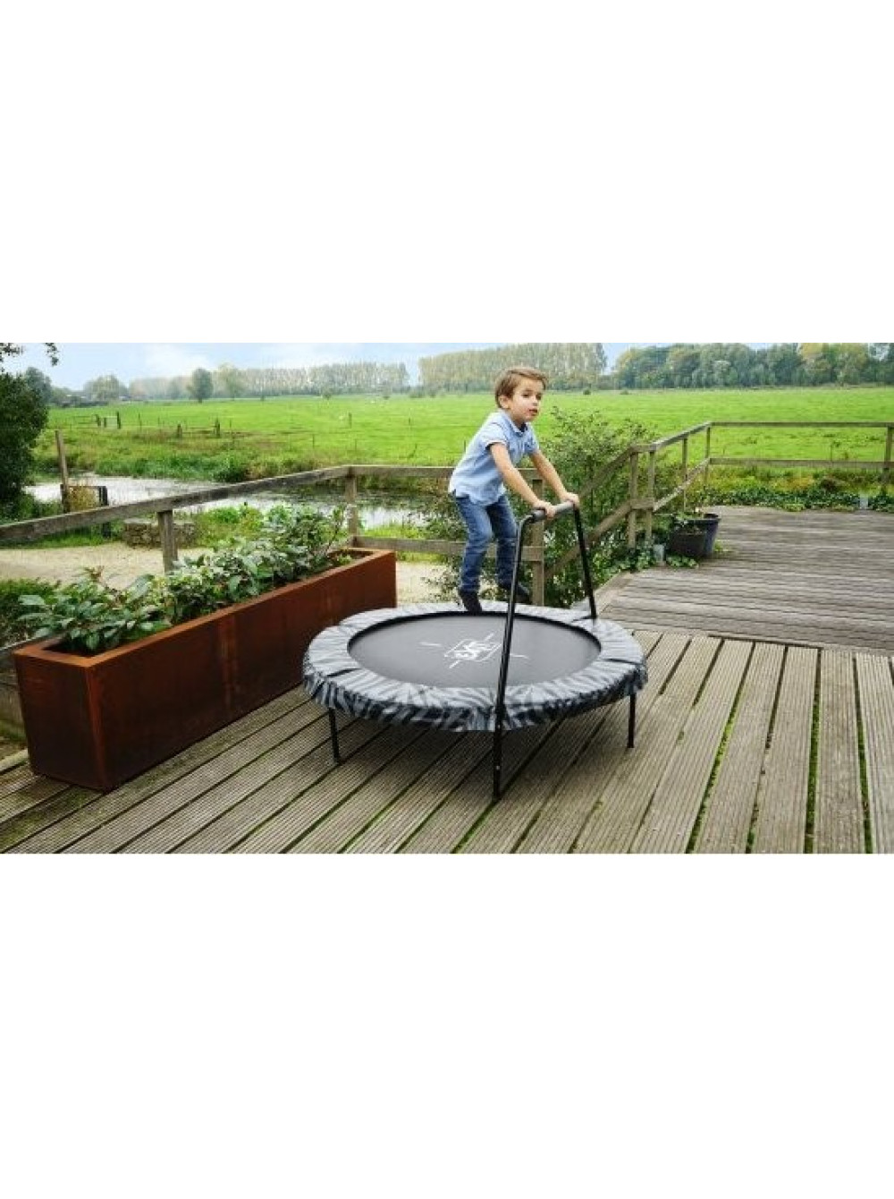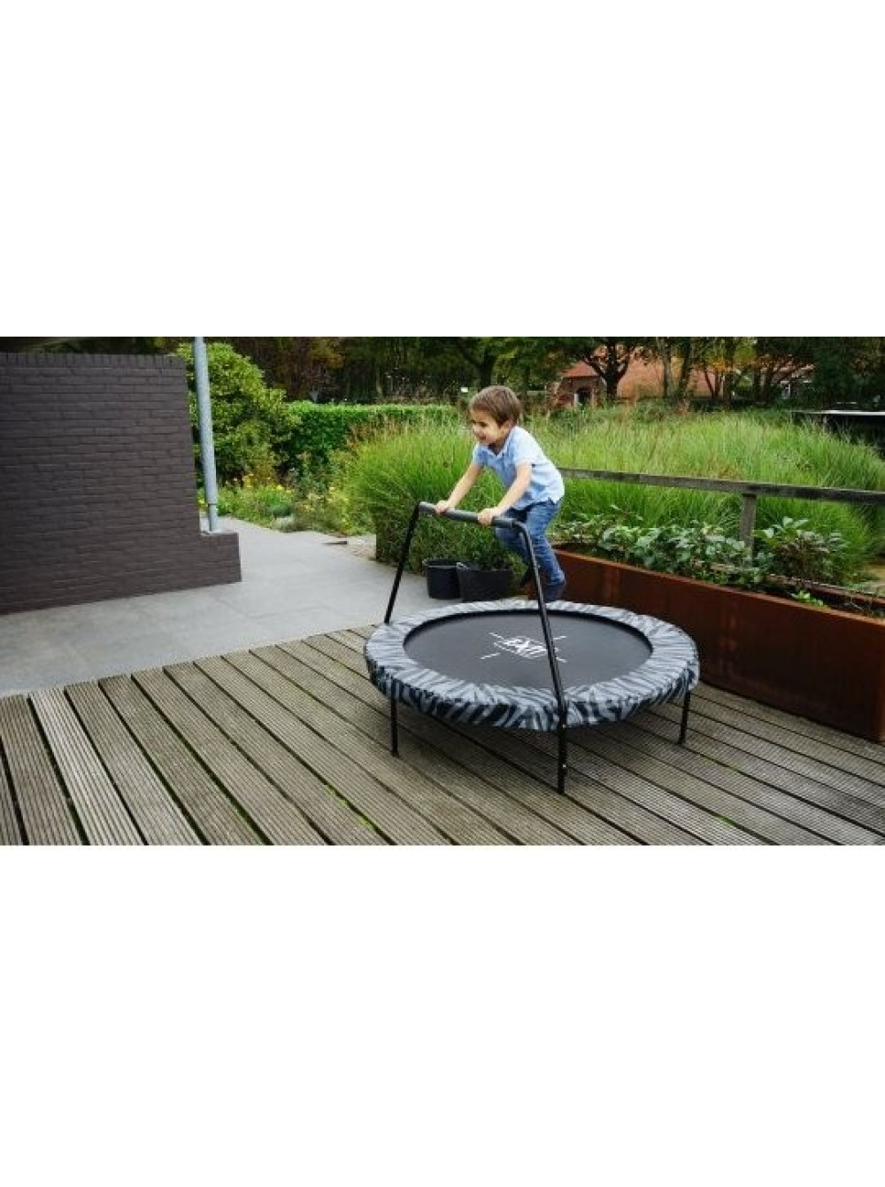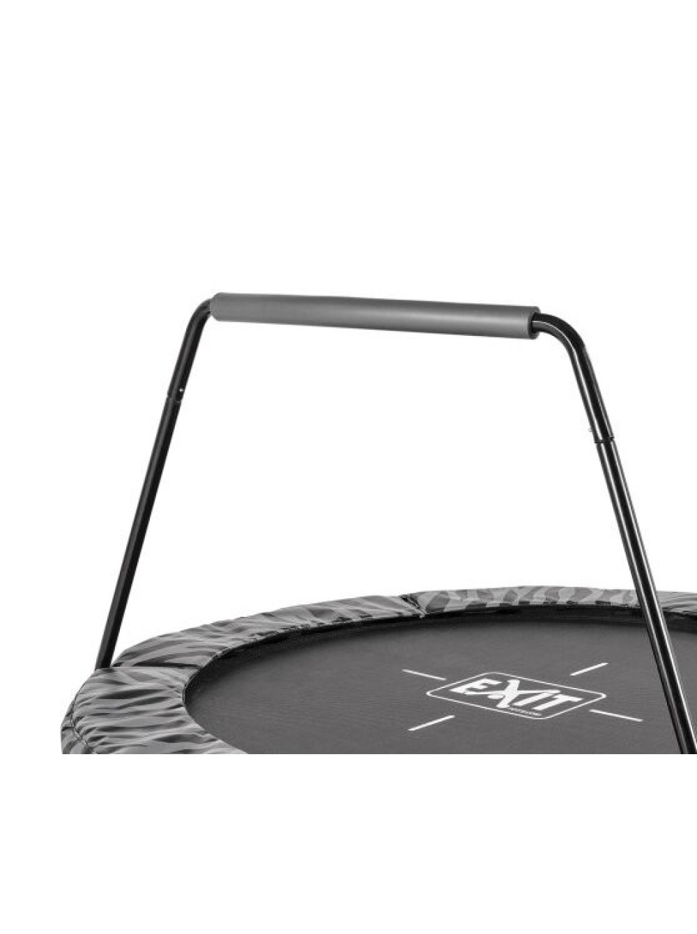 Батут EXIT Tiggy з ручкою 140 см сірий - міні-батут для дітей від двох до шести років. Це компактний круглий батут має надійно закріплену ручку, за яку можна триматися під час стрибків. Батут має унікальний захисний мат на гумки сіро-чорного кольору з леопардовим малюнком. Батут розроблений спеціально для малюків, він не високий, від землі його висота всього 34 см, щоб маленьким дітям було комфортно підніматися на нього.