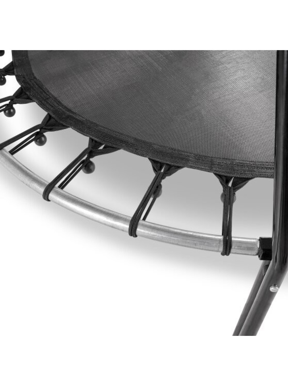 Замість пружин, які є у великих батутах, цей оснащений гумками для забезпечення більш плавного відскоку і м'якої посадки. А в разі невдалого стрибка, завдяки м'якому захисному мату по всьому колу, приземлення будуть завжди безпечними.