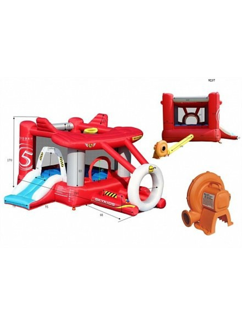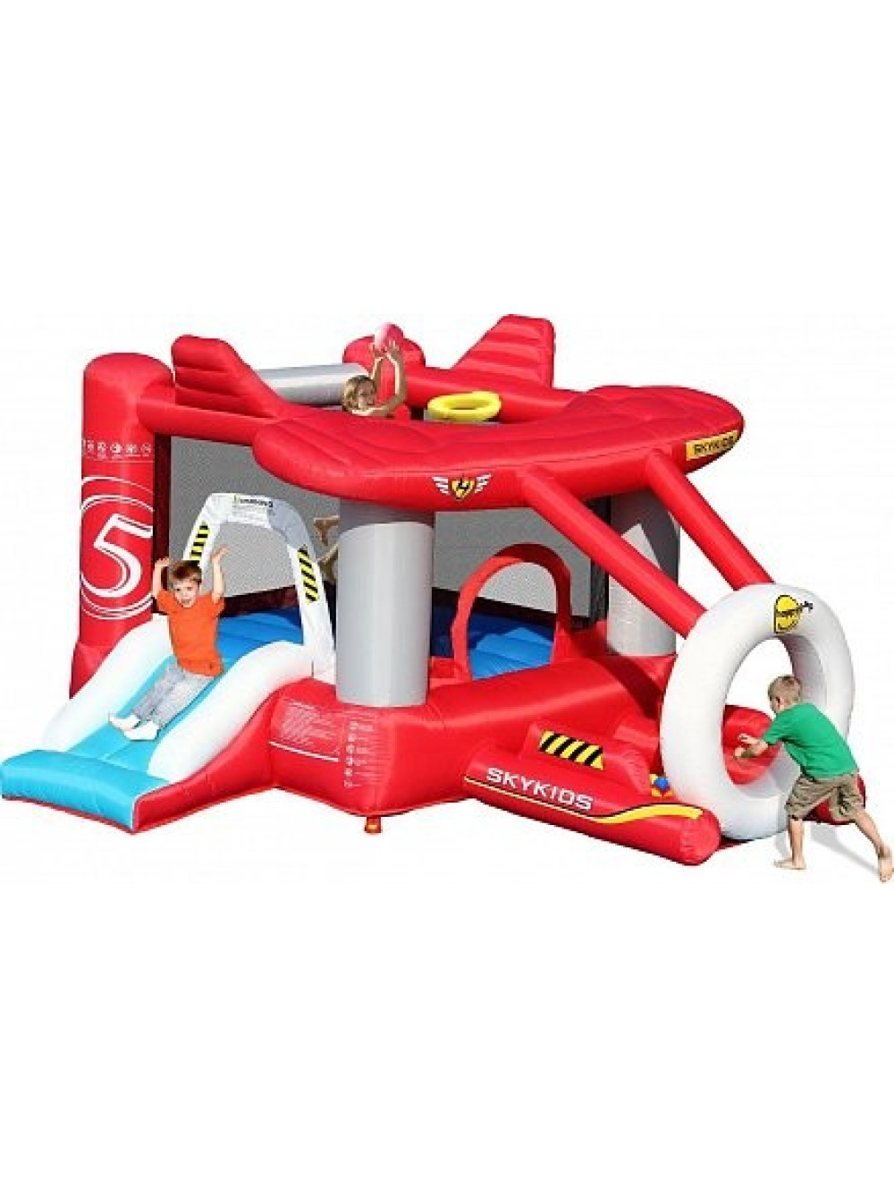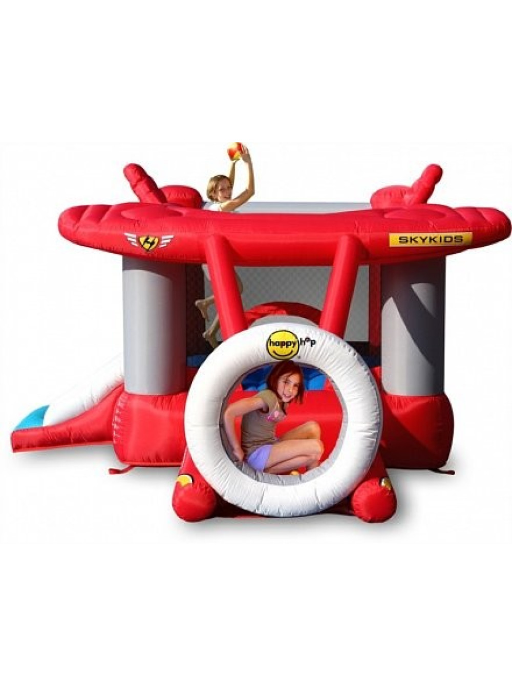 Батут дитячий надувний Літак HAPPY HOP - ця модель виконана в тематиці повітряного судна, має обтічні об'ємні форми і нагадує космоліт, що борознить простори галактики. Незвичайний вигляд цього предмета для ігор і розваг не залишить байдужим жодну дитину, особливо хлопчиків, які мріють стати пілотами ультрасучасних реактивних літаків. Тому заняття і тренування на подібному комплексі з раннього дитинства будуть розвивати витривалість, зміцнювати вестибулярний апарат і позитивно впливати на формування всіх життєво важливих систем організму, що закладе фундамент міцного здоров'я в майбутньому і дозволить оволодіти професією льотчика по-справжньому.
