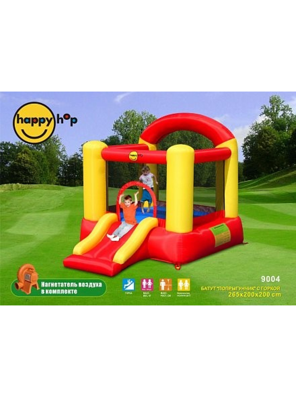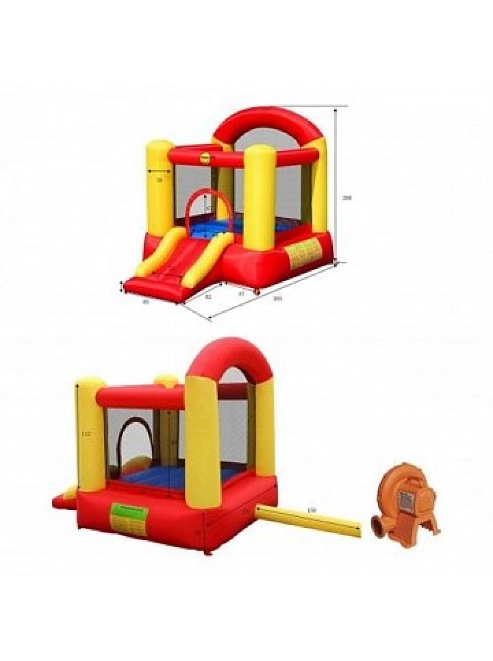 Конструкція має порівняно невеликі розміри, всього чотири квадратних метри 200х200см, у висоту 265см. У комплексі є поверхня для стрибків, яка огороджена захисною сіткою, натягнутою на м'які стовпи. Так що про безпеку дітей можна не хвилюватися. Одночасно на маті для стрибків можуть знаходитися двоє дітей, вагою до 68кг.