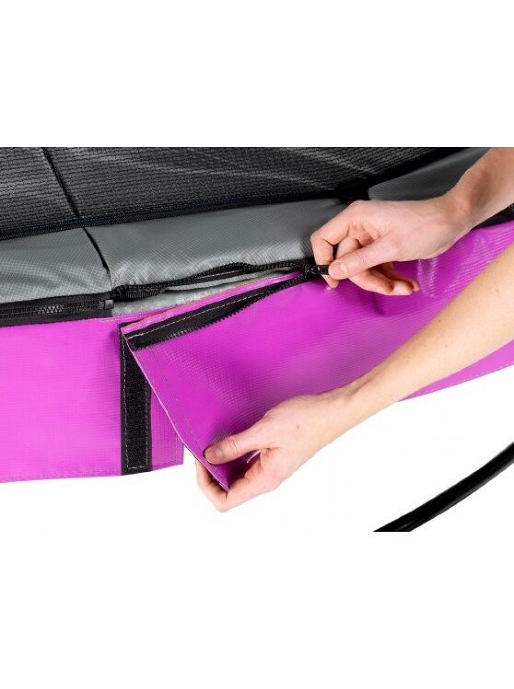 Інноваційна система кріплення полегшує і прискорює час на складання рами в порівнянні з іншими батутами. Фіолетову спідницю можна швидко прикріпити до захисного краю за допомогою блискавки. Захисна накладка міцна і має систему захисту ніг (FPS), який був спеціально розроблений компанією EXIT Toys для відвертання попадання ваших ніг в пружини при підстрибуванні. Впродовж короткого часу батут готовий до використання, так чого ж ви чекаєте?