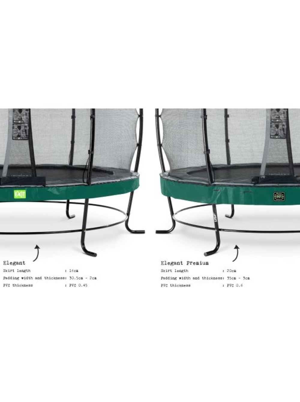 Крім того, батути Елегантні є яскравим прикладом того, що безпека і дизайн йдуть рука об руку, до того ж виріб виглядає статусно і красиво. EXIT Elegant - преміальні батути найвищої якості не тільки красиві, але і довговічні. Рама спочатку гальванізується, а потім покривається фарбою порошковим методом. Подовжені пружини двоконічної форми мають довжину 21,6 см, що гарантує відмінний відскок і м'яке приземлення.
