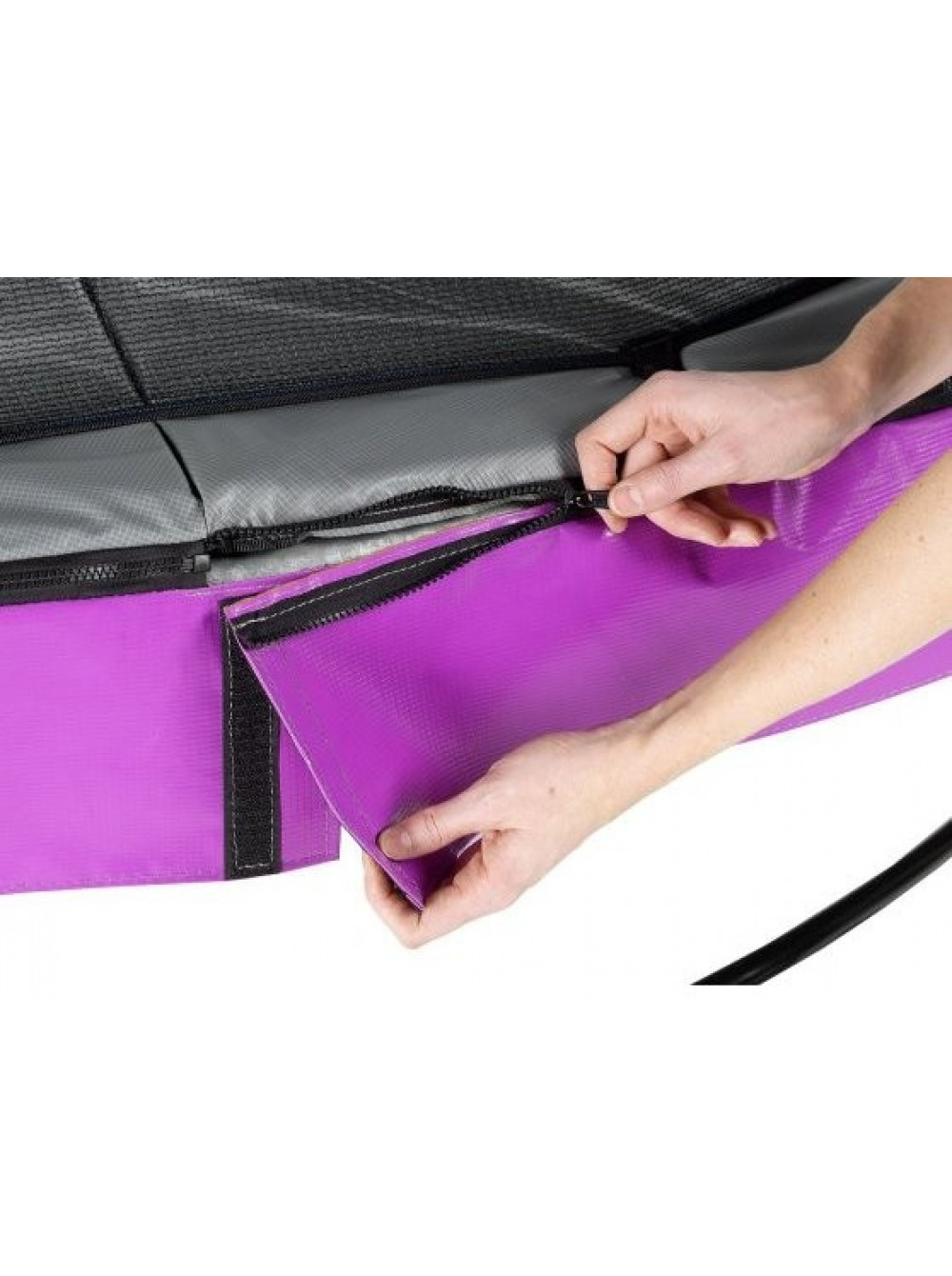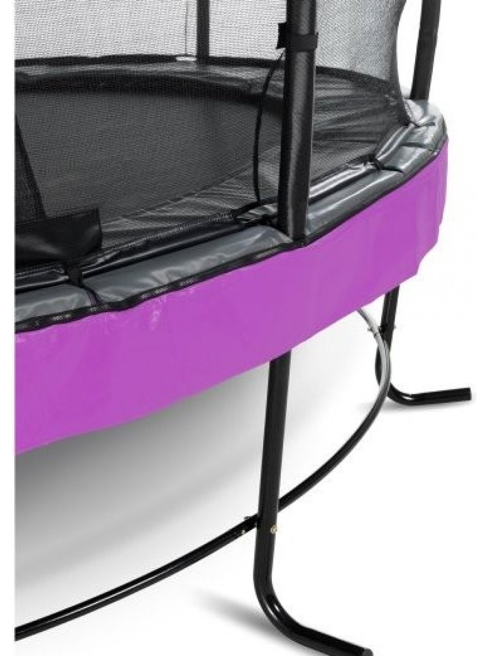Інноваційна система кріплення полегшує і прискорює час на складання рами в порівнянні з іншими батутами. Фіолетову спідницю можна швидко прикріпити до захисного краю за допомогою блискавки. Захисна накладка міцна і має систему захисту ніг (FPS), яка була спеціально розроблена компанією EXIT Toys для відвертання попадання ваших ніг в пружини при підстрибуванні. Впродовж короткого часу батут готовий до використання, так чого ж ви чекаєте?