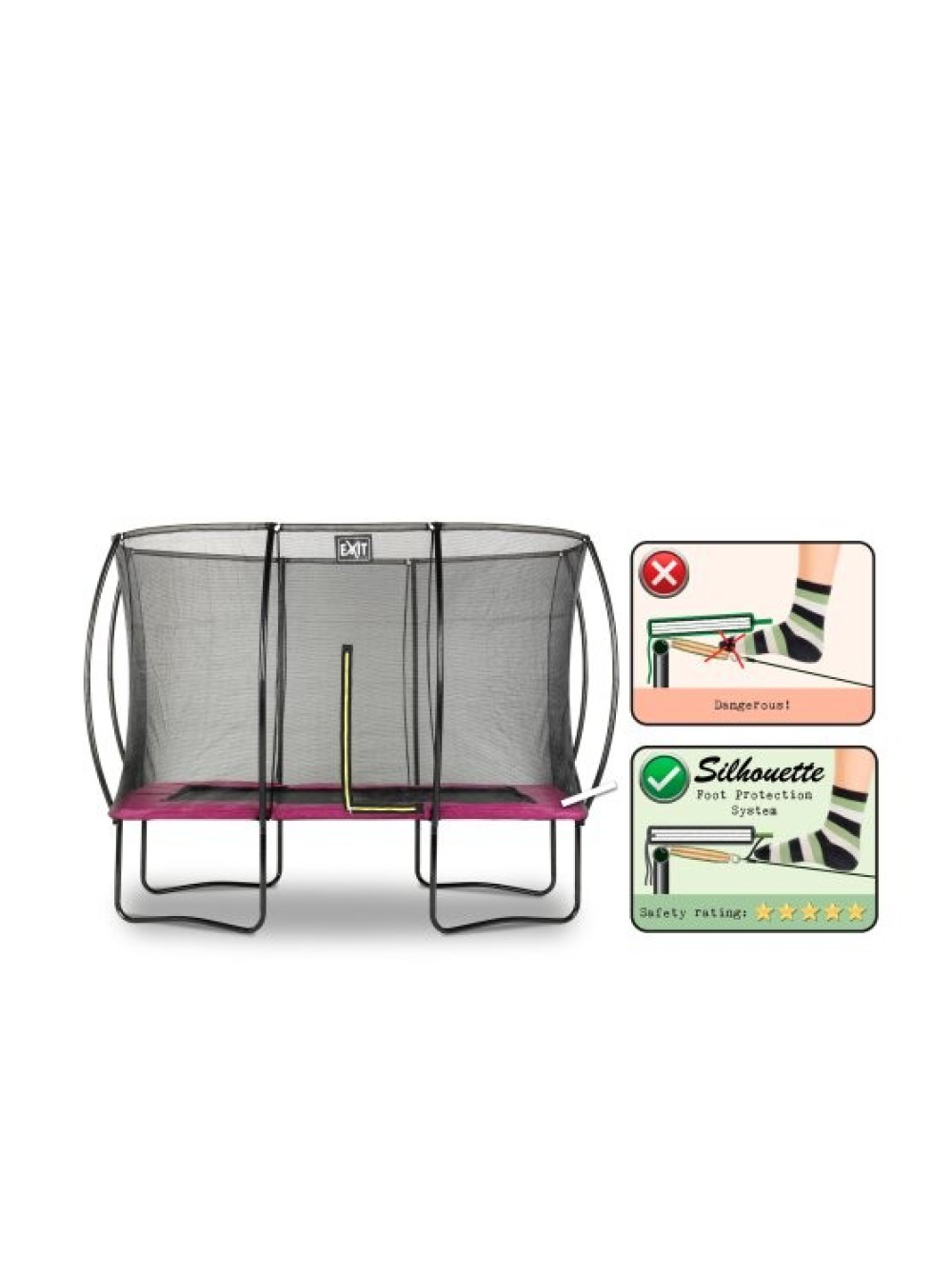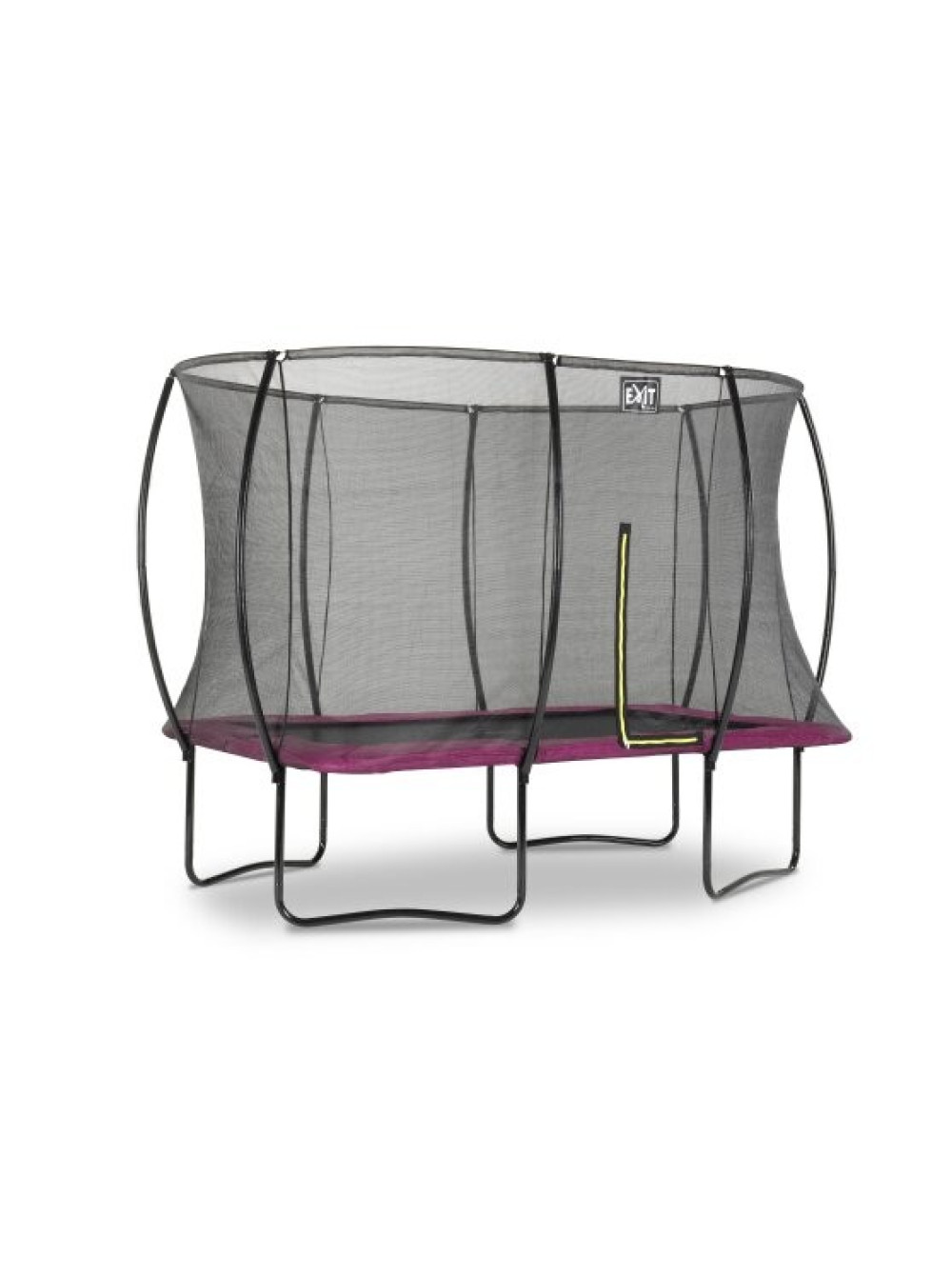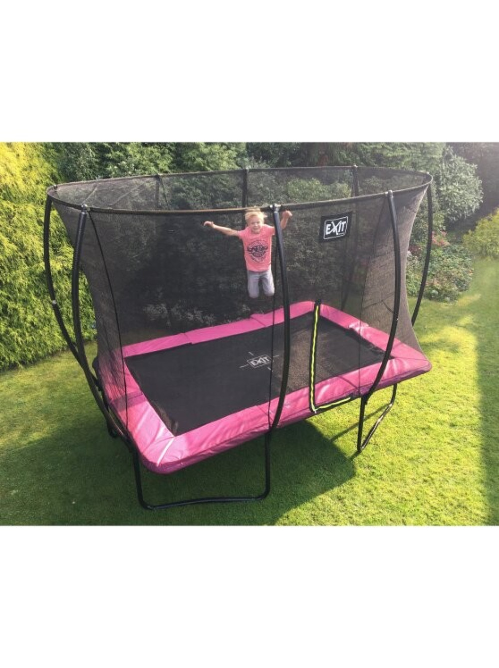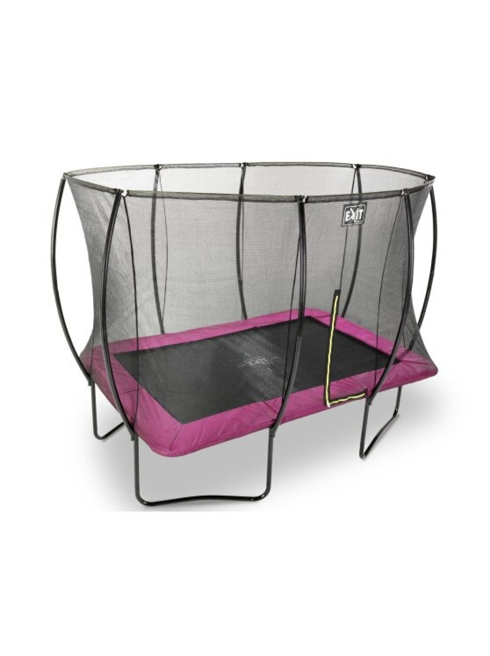 Батут EXIT Silhouette прямокутний 214x305 рожевий на ніжках. Красивий, надійний, довговічний, сучасний і прекрасно розроблений, без сумнівів, буде чудово виглядати в будь-якому саду або дворі будинку. Конструкція досить стійка і поставляється в комплекті з захисною сіткою, яка зручно відкривається з допомогою флуоресцентної блискавки зеленого кольору, так що Ви відразу зможете побачити закрита блискавка належним чином.