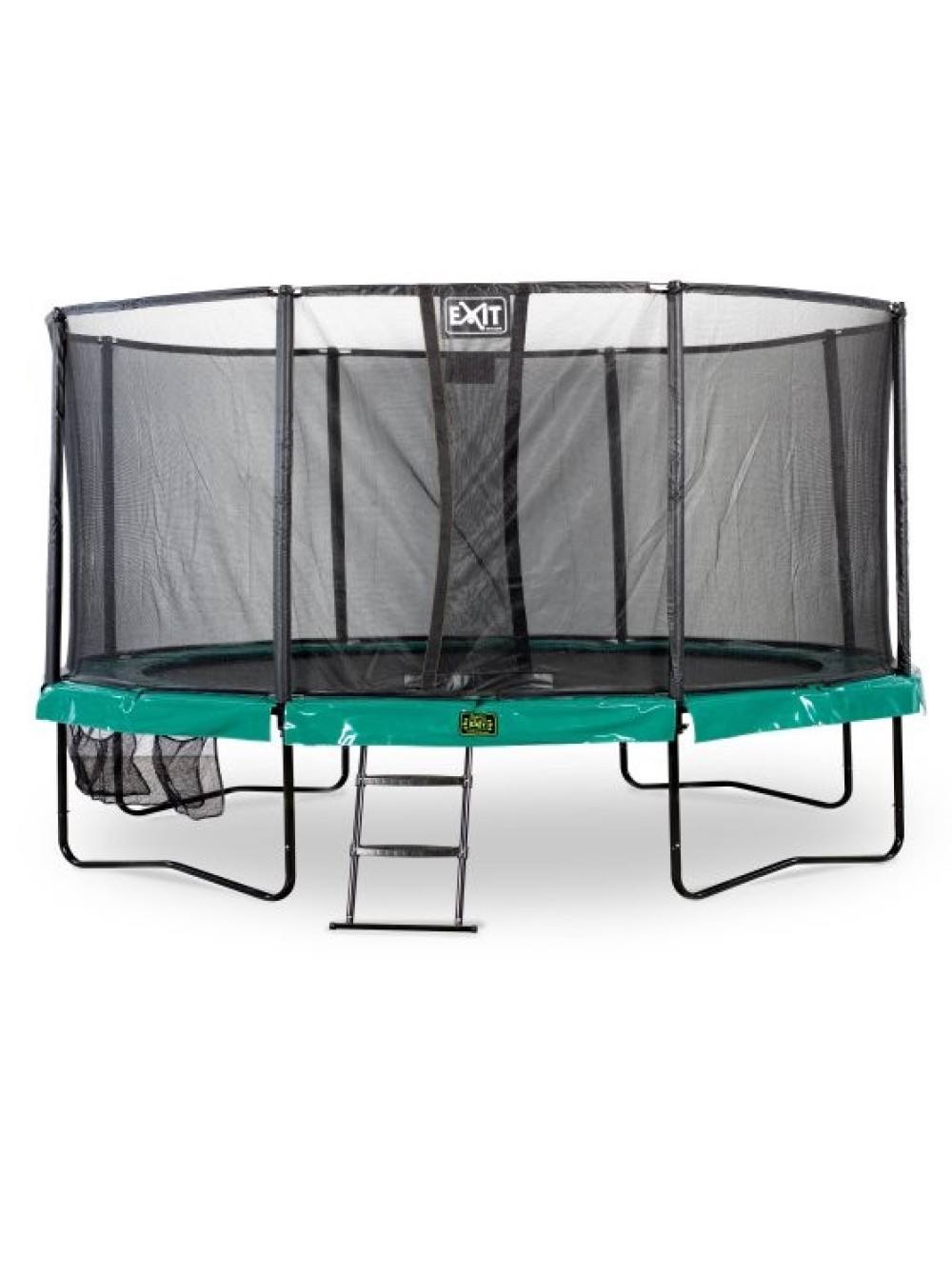 Батут EXIT Supreme 427 см з драбинкою і сумкою для взуття круглої форми із захисною кромкою зеленого кольору і бездоганної якості. Батут на металевих опорах, стандартно поставляється з сіткою безпеки з входом для дітей.