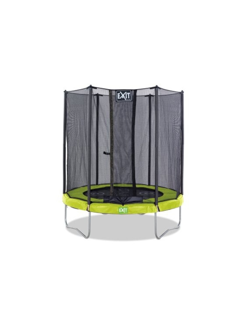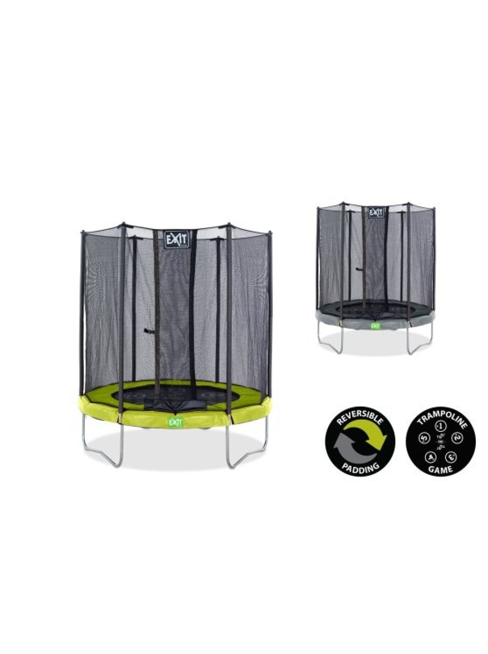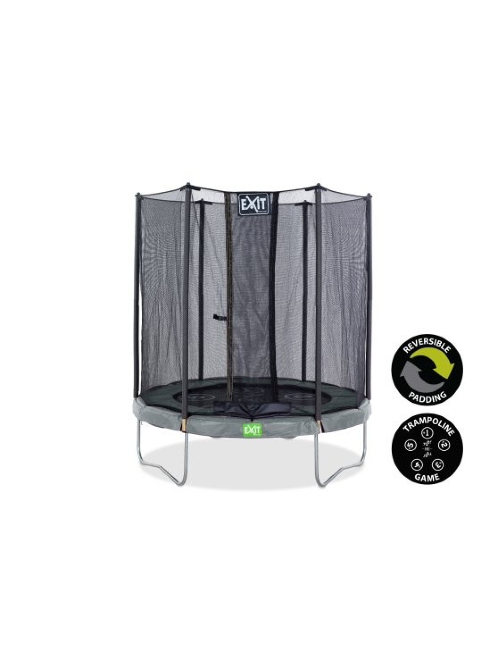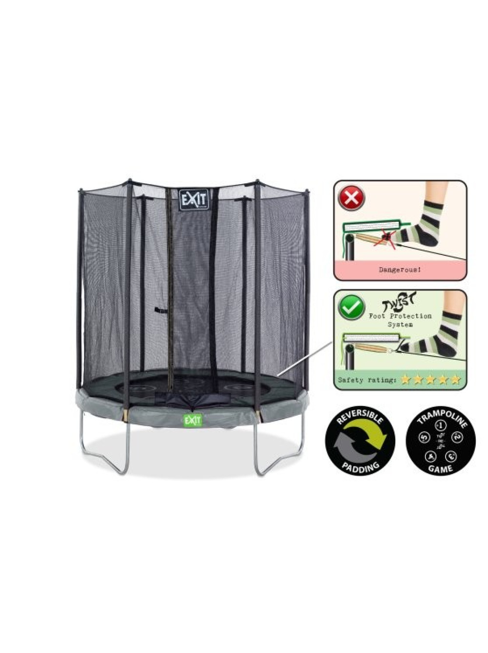 Батут EXIT Твіст ø244 см - це компактний круглий батут з двоколірним захисним матом, зеленого і сірого кольорів. Батут на металевих ногах в комплекті з сіткою безпеки, яка забезпечує захист того, що стрибає під час експлуатації. Вхід для дітей без застібки-блискавки, але з дверима, що перекриваються, що сприяє більшому комфорту і надійності - дитина не зможе особисто, без участі дорослих, використати батут