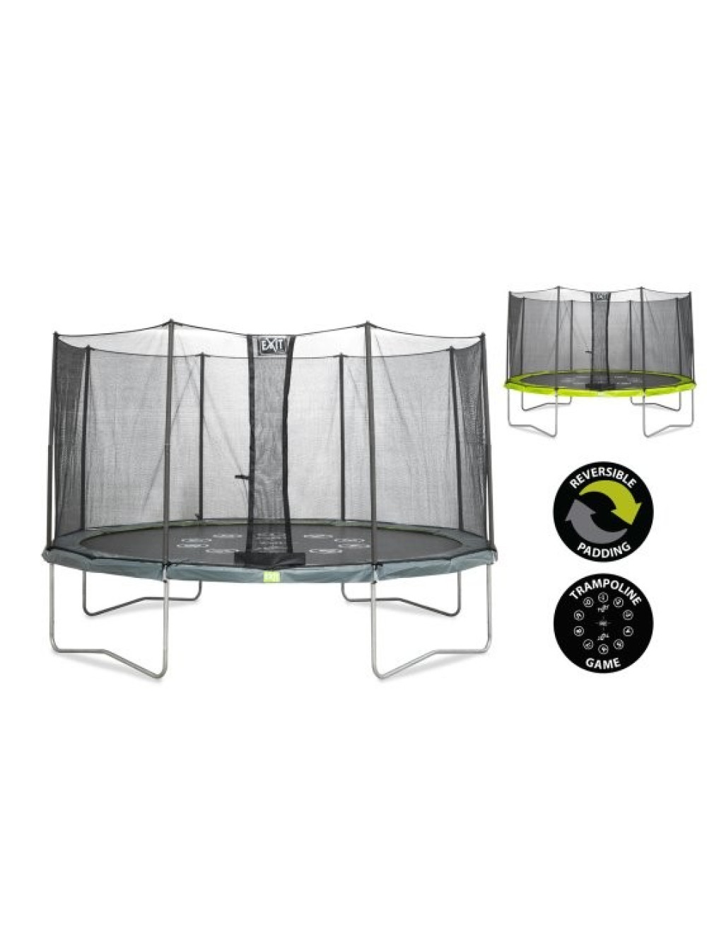 Батут EXIT Twist ø427cm - зелений/сірий - це великий круглий батут з двоколірним захисним матом, зеленого і сірого кольорів. Батут на металевих ногах в комплекті з сіткою безпеки, яка забезпечує захист того, хто стрибає під час експлуатації. Вхід для дітей без застібки-блискавки, але з дверима, що перекриваються, що сприяє більшому комфорту і надійності - дитина не зможе особисто, без участі дорослих, використати батут