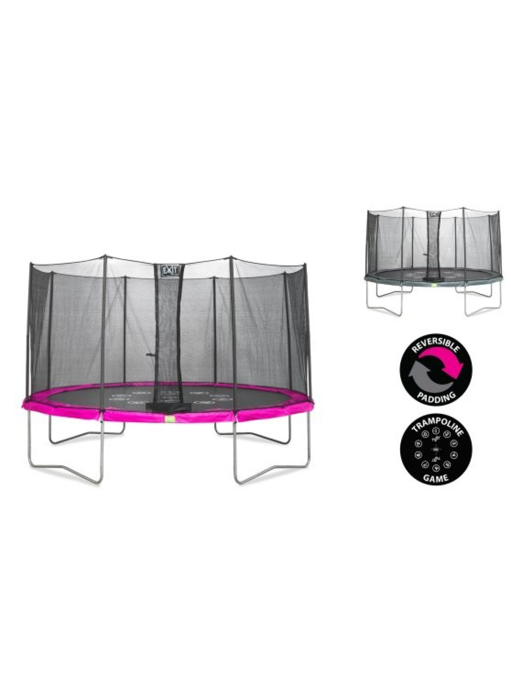 Батут EXIT Twist рожевий/сірий ø427cm - це великий круглий батут з двоколірним захисним матом, рожевого і сірого кольорів. Батут на металевих ногах в комплекті з сіткою безпеки, яка забезпечує захист того, хто стрибає під час експлуатації. Вхід для дітей без застібки-блискавки, але з дверима, що перекриваються, що сприяє більшому комфорту і надійності - дитина не зможе особисто, без участі дорослих, використати батут