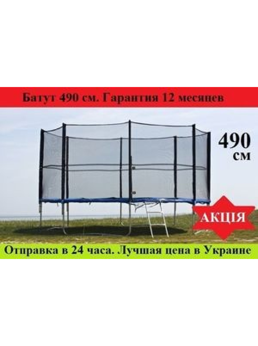 Батут ФанФіт 490 см з сіткою і сходами синього, червоного або зеленого кольору - тренажер досить місткий і великий, підійде для інтенсивних навантажень і безтурботного проведення часу кількох дітей і навіть дорослих.