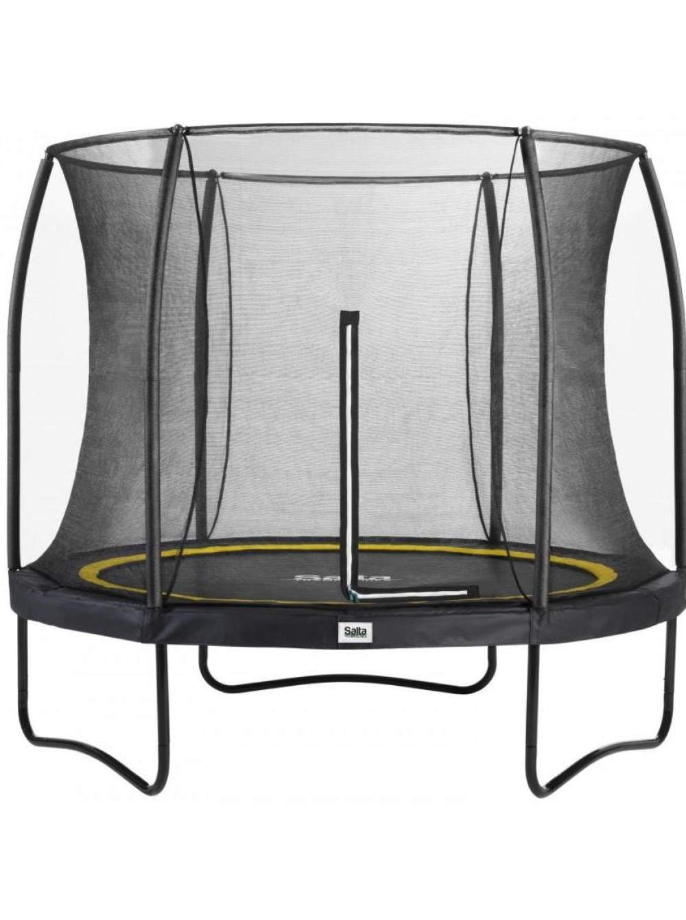 Рами з оцинкованої сталі із чорним глянцевим покриттям утворюють надійну основу батута. Захисна сітка призначена для забезпечення оптимального захисту та безпеки під час стрибків. Конструкція сталевого верхнього обода утримує сітку безпеки у натягнутому вигляді. Крім того, вхід на батут обладнаний застібкою-блискавкою, що дозволяє легко входити та закривати його.