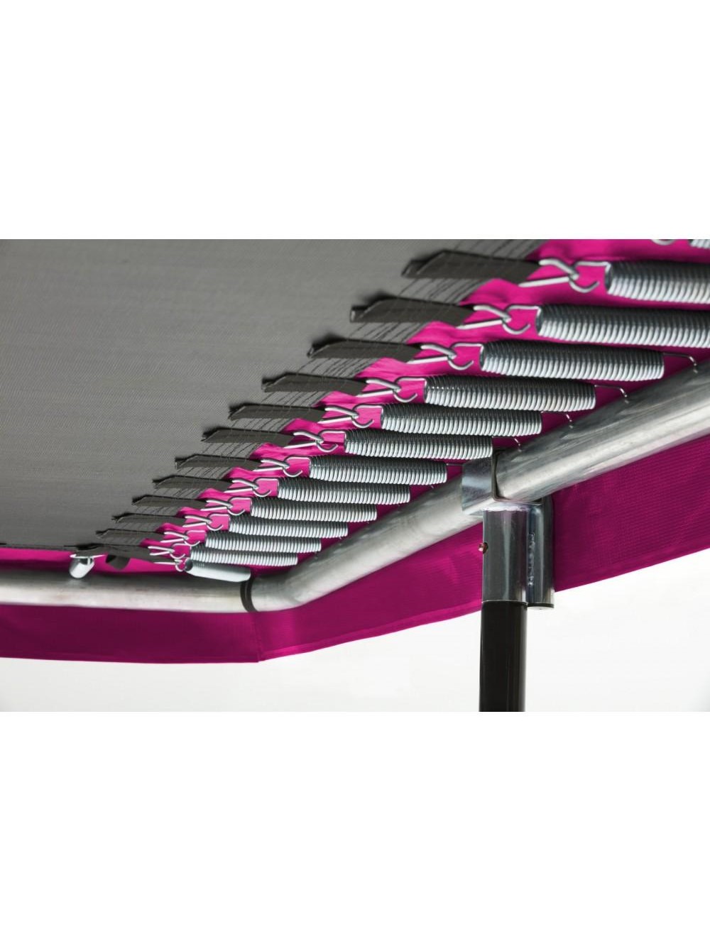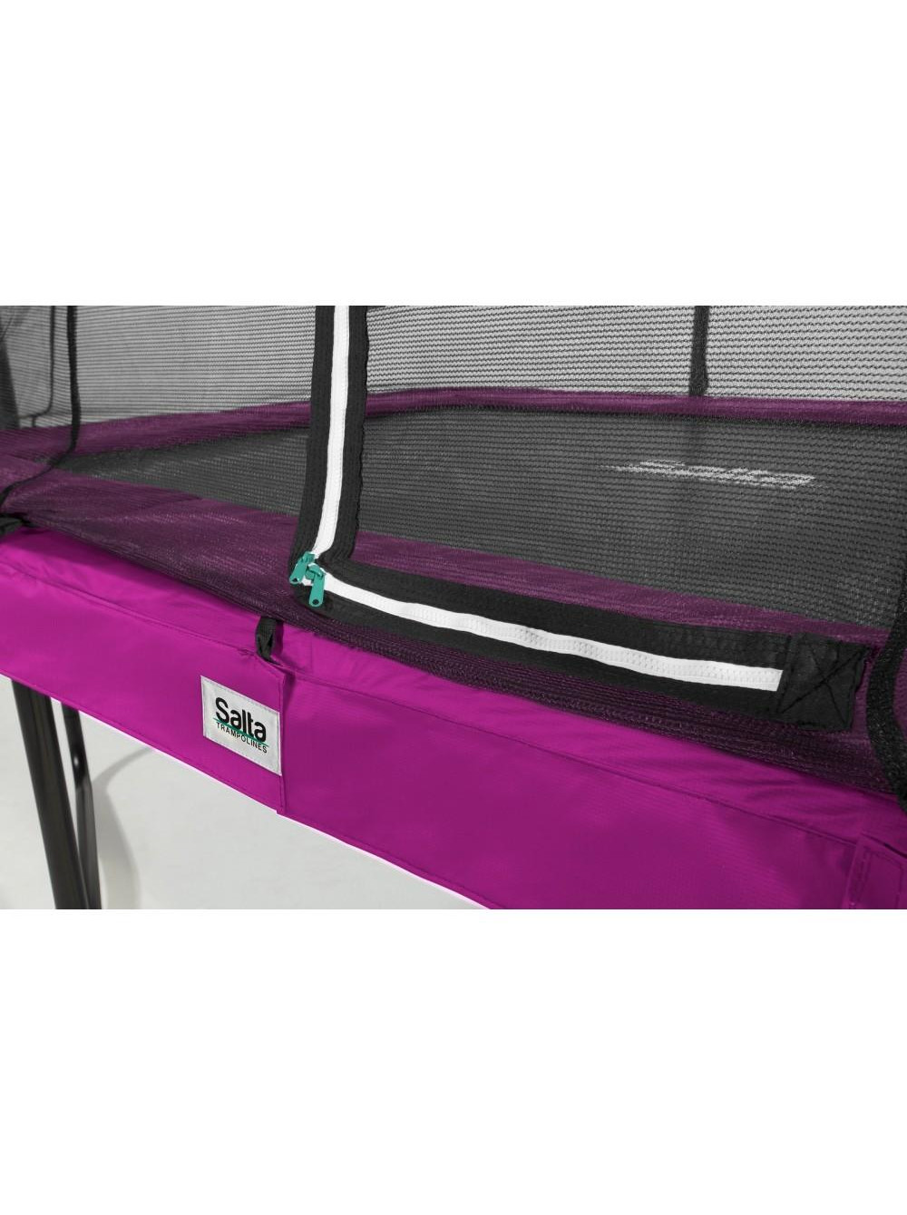 Рами з оцинкованої сталі із чорним глянцевим покриттям утворюють надійну основу батута. Захисна сітка призначена для забезпечення оптимального захисту та безпеки під час стрибків. Конструкція сталевого верхнього обода утримує сітку безпеки у натягнутому вигляді. Крім того, вхід на батут обладнаний застібкою-блискавкою, що дозволяє легко входити та закривати його.