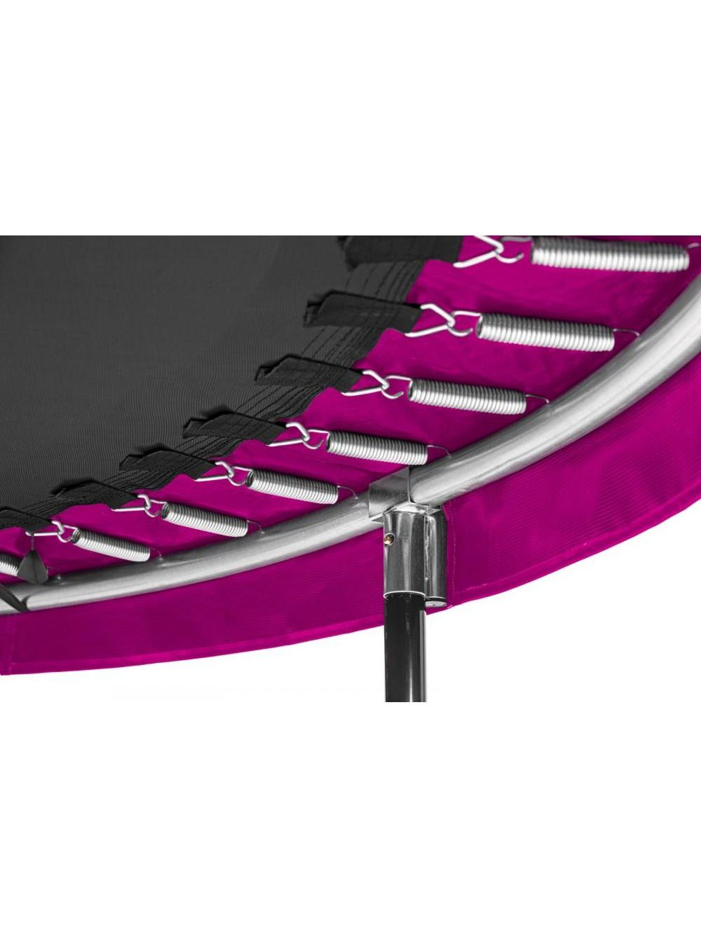Рами з оцинкованої сталі із чорним глянцевим покриттям утворюють надійну основу батута. Захисна сітка призначена для забезпечення оптимального захисту та безпеки під час стрибків. Конструкція сталевого верхнього обода утримує сітку безпеки у натягнутому вигляді. Крім того, вхід на батут обладнаний застібкою-блискавкою, що дозволяє легко входити та закривати його.