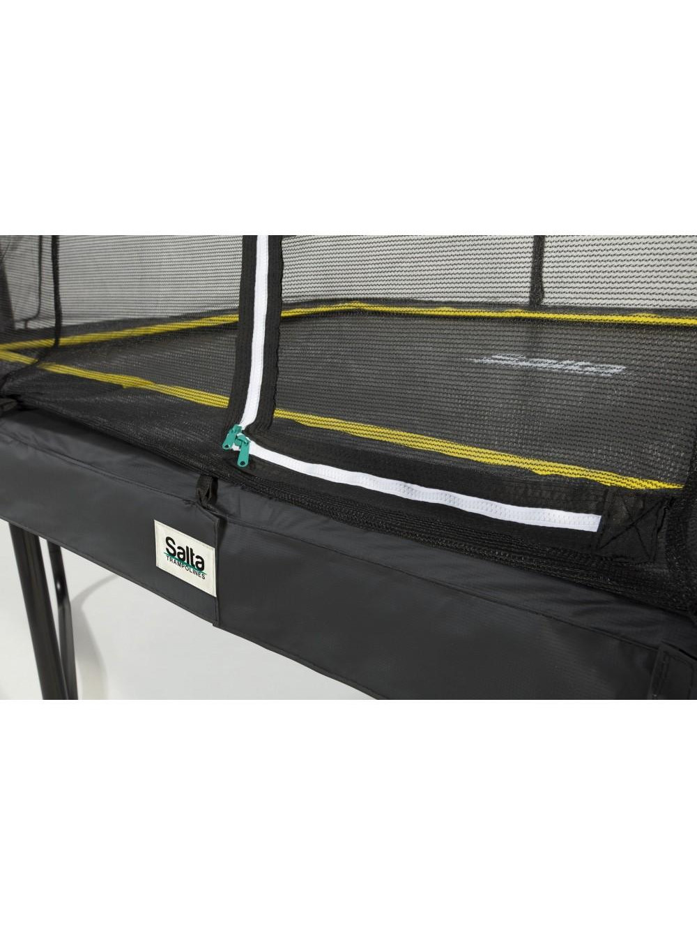 Рами з оцинкованої сталі із чорним глянцевим покриттям утворюють надійну основу батута. Захисна сітка призначена для забезпечення оптимального захисту та безпеки під час стрибків. Конструкція сталевого верхнього обода утримує сітку безпеки у натягнутому вигляді. Крім того, вхід на батут обладнаний застібкою-блискавкою, що дозволяє легко входити та закривати його.