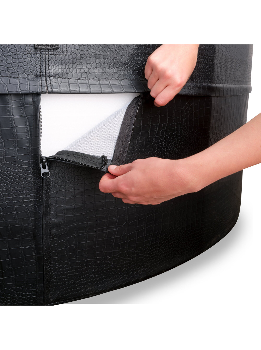 СПА Басейн EXIT Premium обов'язково сподобається і захопить з першого погляду своїми контрастними кольорами - чорний з візерунком текстури шкіри зовні і білий - всередині. Цей басейн з джакузі має пінопластову стінку товщиною 8 сантиметрів, тому він стійкий і зводить до мінімуму втрати тепла. Крім того, поролонова основа забезпечує відмінний комфорт для сидіння. А якщо ви не хочете користуватися джакузі якийсь час? Надувна кришка з ізолюючим чохол-накриття з запобіжним замком дозволяє легко закрити гідромасажну ванну і зберегти воду теплою.