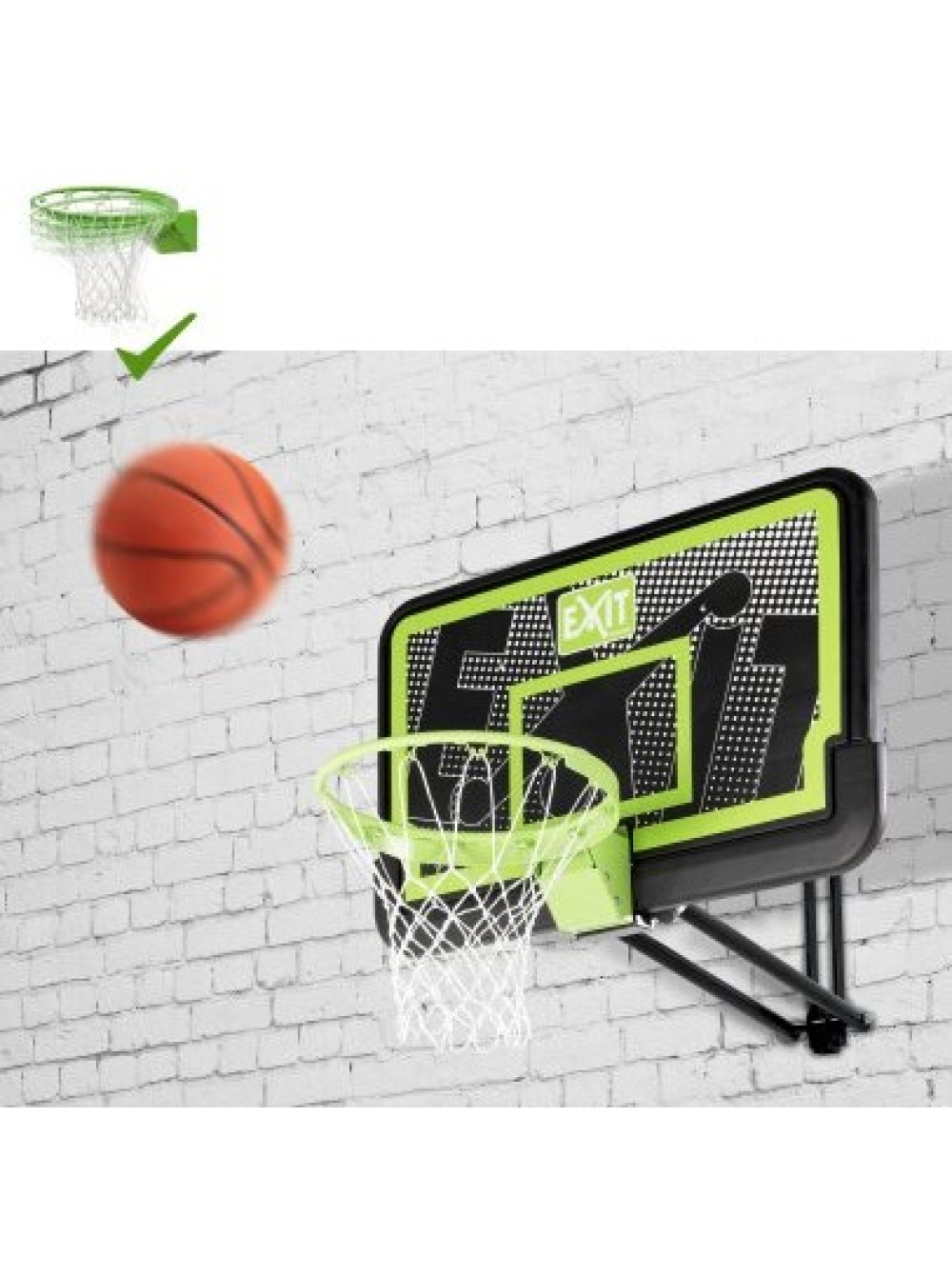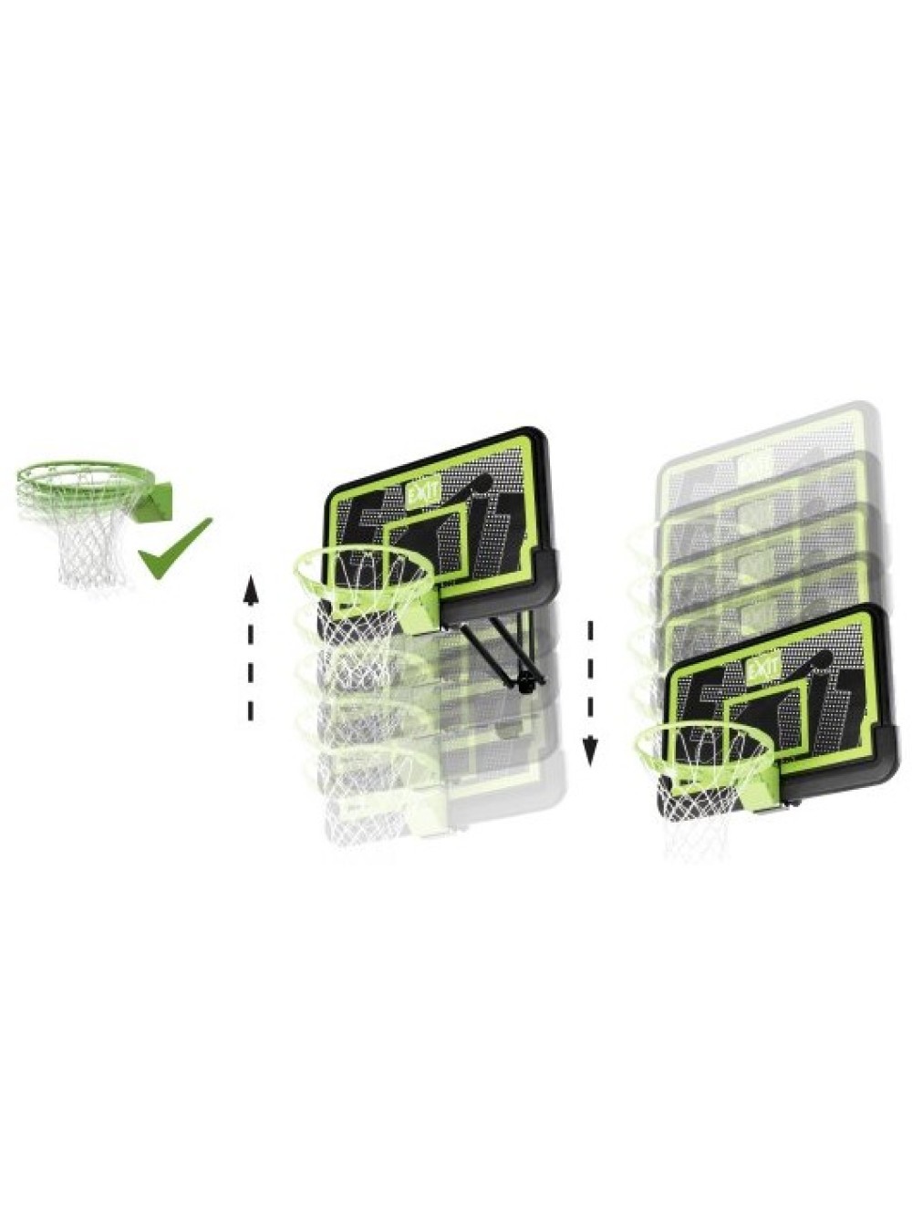 Баскетбольний щит Exit регульований чорний + кільце з амортизацією, на металевому каркасі, виконаний з міцного матеріалу - полікарбонату. Цей баскетбольний щит можна легко закріпити на стіні, що робить його відповідним для для будь-яких приміщень або вуличного спортивного майданчика. Баскетбольний щит регулюється по висоті в п'яти положеннях (230 - 245 - 260 - 285 - 305 см), тому він ідеально зручний для використання дорослими і дітьми.