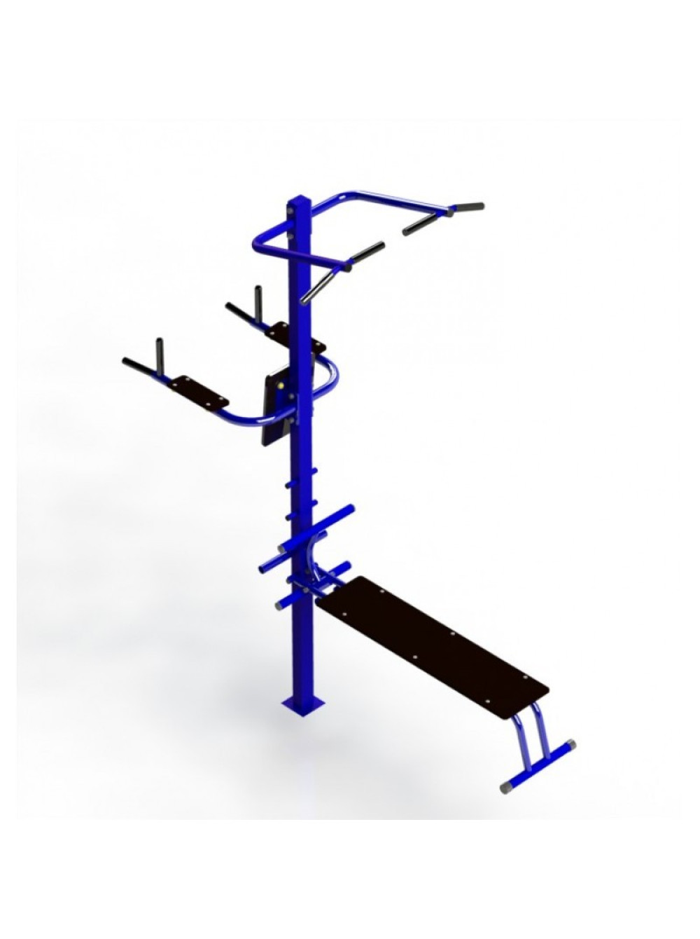 Тренажер комбінований вуличний 3 є універсальним спортивним тренажером для занять на свіжому повітрі. Тренажер комбінований вуличний 3 включає в себе такі елементи: бруси, турнік, лава для преса. Тому на такому тренажері ви зможете опрацювати різні групи м'язів такі як, наприклад рук, преса, спини.